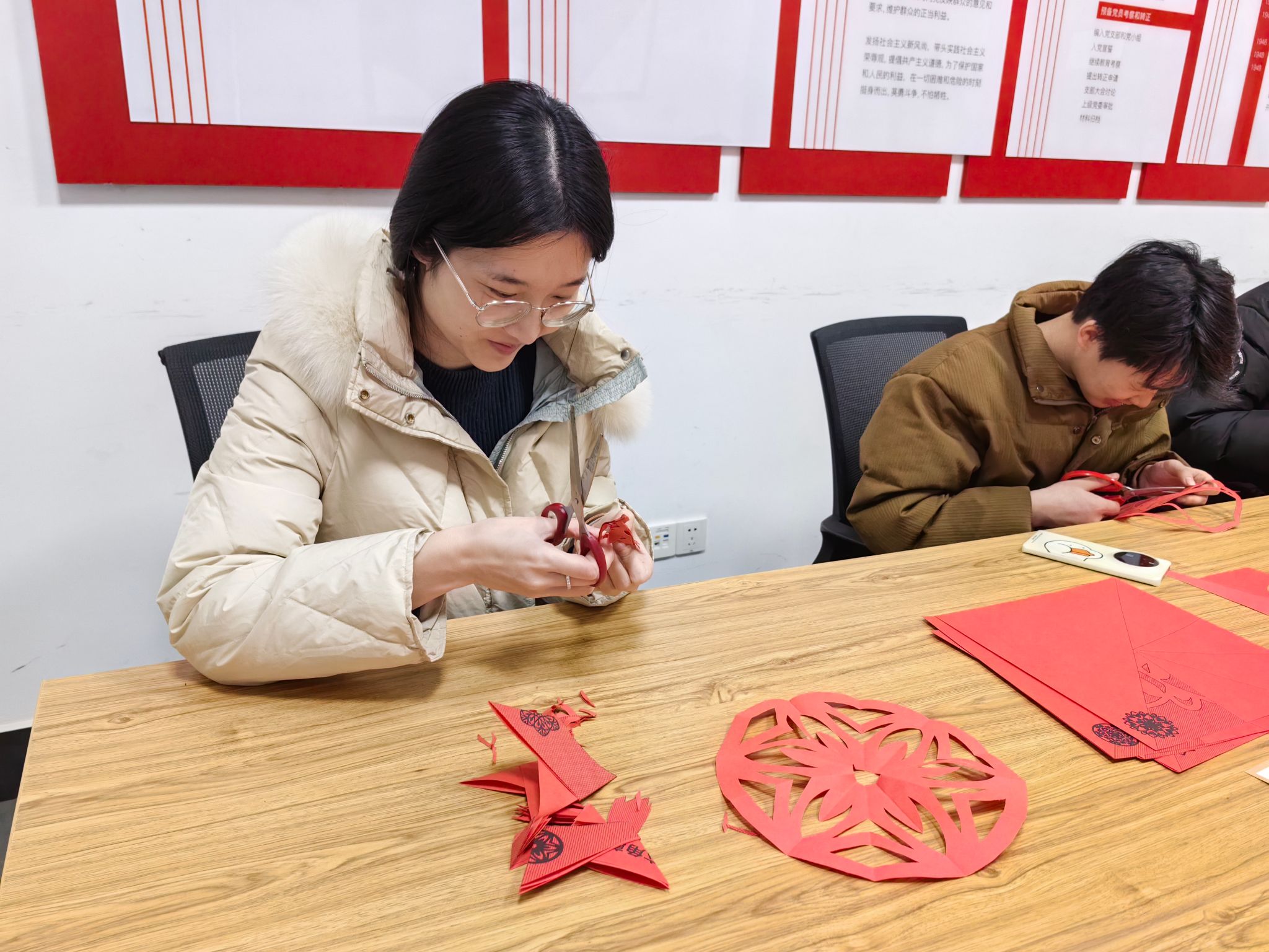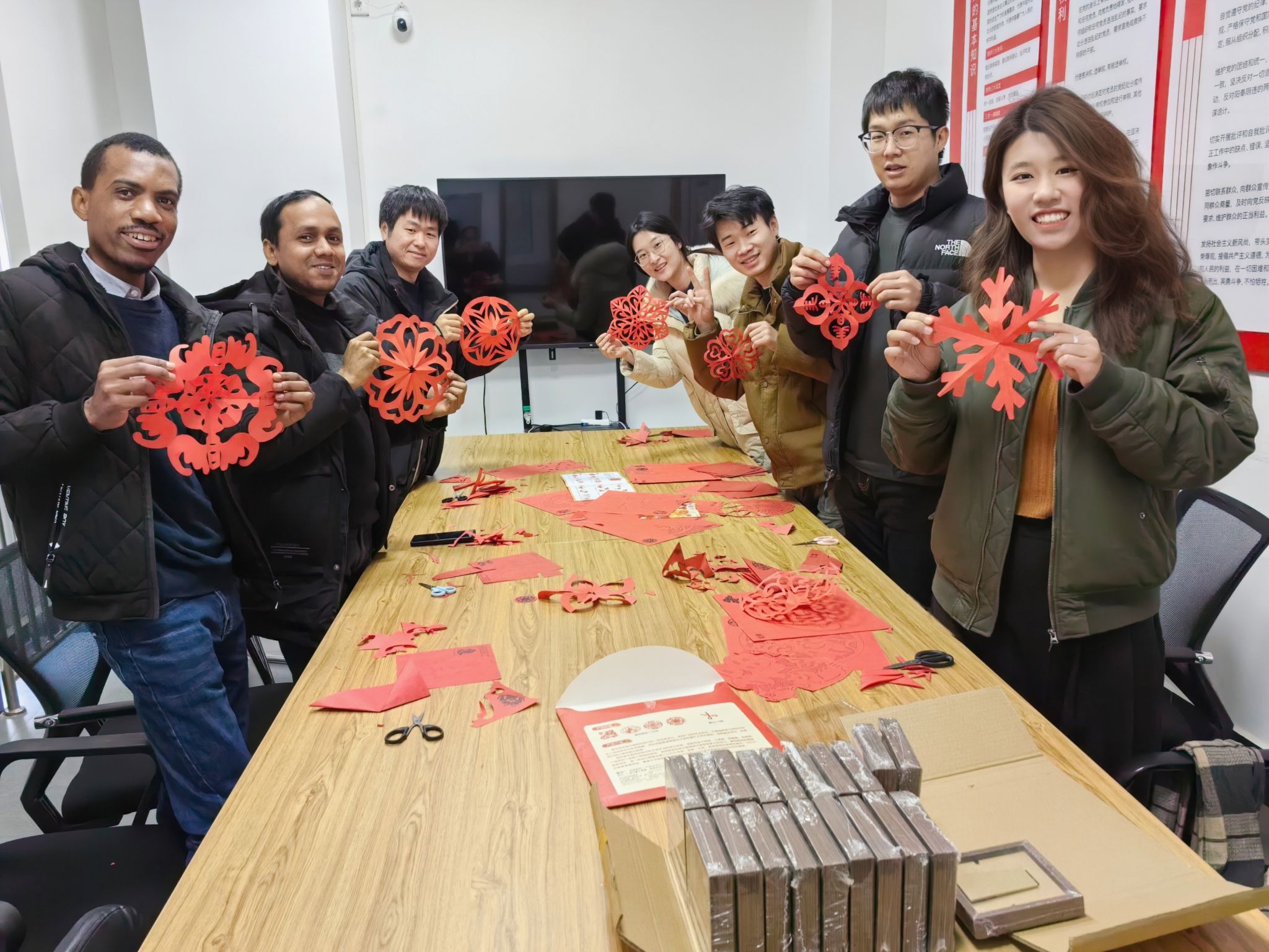 “这是我第一次剪纸!”“你的这个窗花好漂亮!”1月27日,正值农历腊月二十八,辅导员于姝宁老师与同学们共同开展“共祝好运连连,制作新春楹联”剪纸活动。象征吉祥如意的窗花、寓意美好的福字不断呈现,师生们纷纷动手,用一张红纸、一把剪刀,为即将到来的新春佳节增添一抹喜庆的“中国红”。制作过程中,同学们彼此交流技巧,分享创作灵感,留学生们更是不断就春节习俗、传统图案寓意等问题与身边的师生交流,感受中华传统文化魅力。