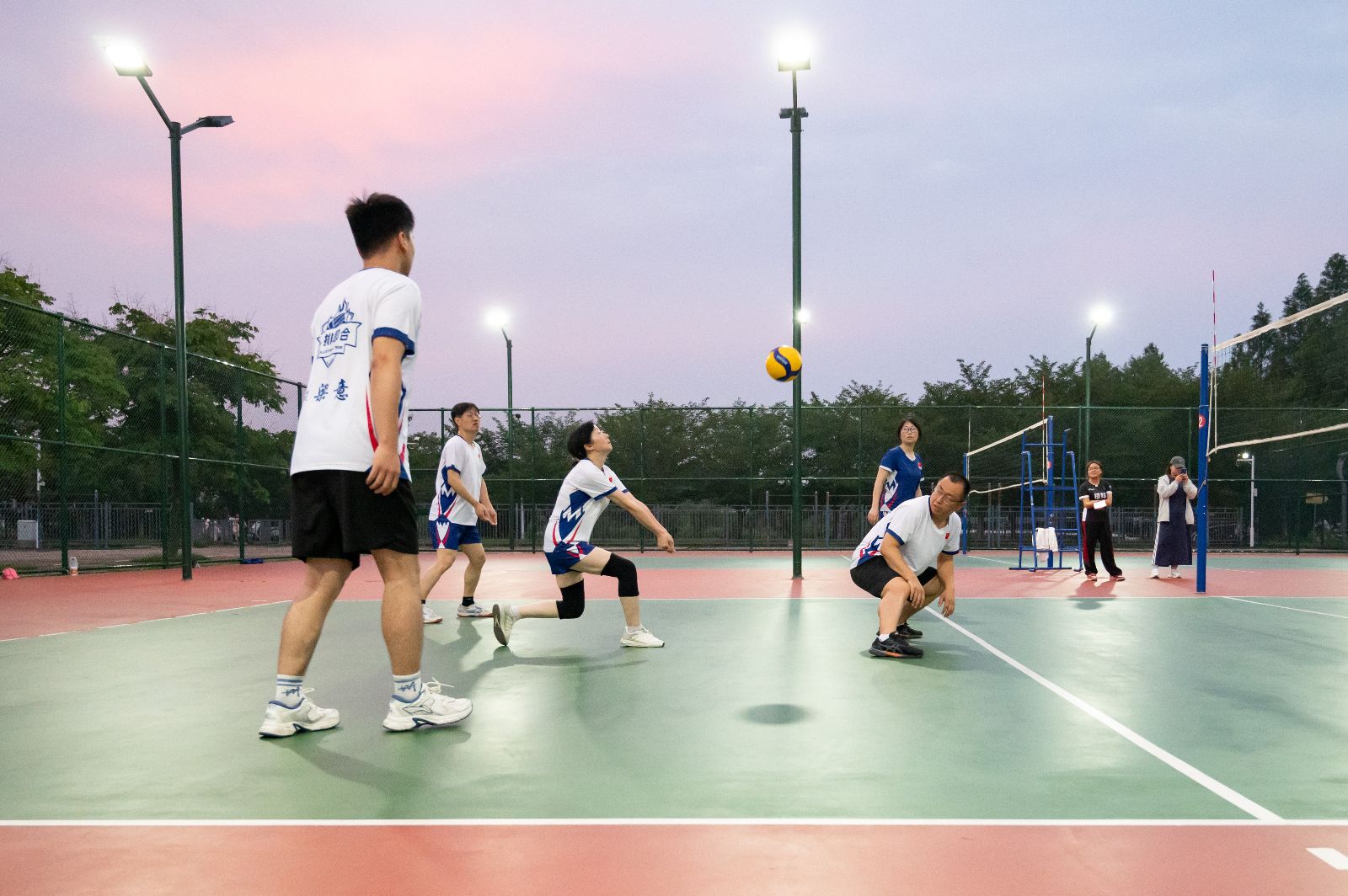 “开心打球50年” 的汪波老师在场上指挥若定,组织四号位冲进战术。刘翰老师心领神会,迅速跟进,却出其不意地选择了轻拍六号位,球划过网前,正向地面坠去。“一排即合”老师反应神速,前排队员迅速下蹲,让出防守空间,后排老师则如离弦之箭般向前冲去,稳稳将球接起,动作流畅而默契,展现出长久磨砺的团队配合,赛场瞬间被这精彩的防守反击感染。