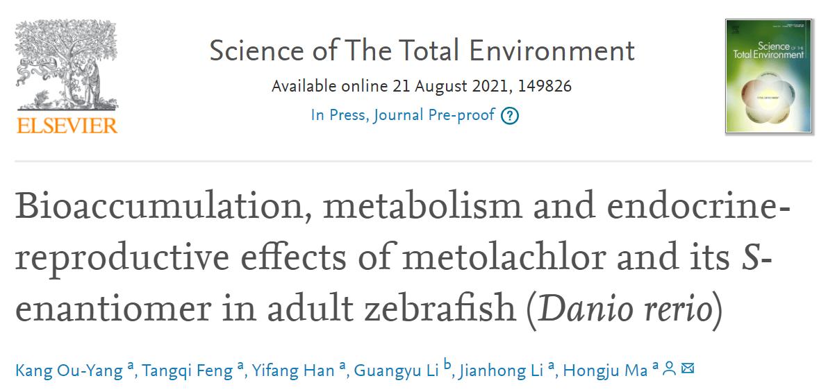 近日,我院农药毒理学&有害生物抗药性团队的研究进展在线发表,研究首次明确了氯乙酰胺类除草剂异丙甲草胺及其高效异构体S-异丙甲草胺在模式生物斑马鱼体内的富集、代谢行为,揭示了其对斑马鱼内分泌-生殖的毒性及作用机制,为该类除草剂的生态环境风险评估和手性农药的科学合理使用提供了重要的理论依据。