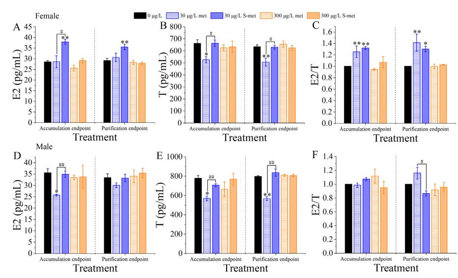 研究发现高浓度异丙甲草胺显著抑制斑马鱼解毒代谢酶活性和肝脏发育,破坏抗氧化系统。进一步研究明确了异丙甲草胺和S-异丙甲草胺能通过不同途径显著改变斑马鱼HPG轴相关基因的表达,破坏雌鱼性激素稳态,进而影响斑马鱼的生殖发育;而且,雌鱼对两种药剂更为敏感,具有性别特异性。此外,暴露后的斑马鱼在清水中净化7天后,受药剂影响的大部分酶的活性、激素水平,以及相关基因表达水平均有所恢复,这与两种药剂在斑马鱼体内的快速代谢密切相关。深入探究异丙甲草胺和S-异丙甲草胺对斑马鱼富集、代谢行为和内分泌-生殖毒性的差异,为研究氯乙酰胺类除草剂对非靶标生物的毒性奠定了重要基础。