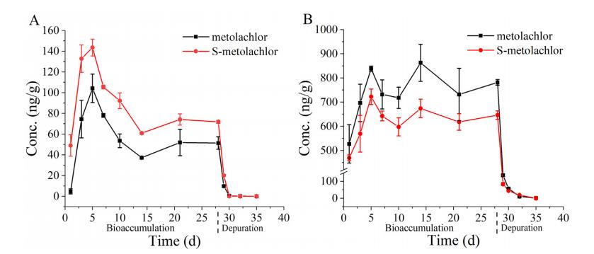 杂草苗前防治对田间杂草的控制至关重要,氯乙酰胺类除草剂是目前世界上使用最多的芽前除草剂,广泛应用于田间防除多种禾本科杂草和阔叶杂草。异丙甲草胺分子结构中同时含有手性碳原子和手性N轴两个手性中心,存在4种立体异构体。异丙甲草胺是含等比例S体和R体的外消旋体,精异丙甲草胺是富集了高效S-构型异构体,除草活性比异丙甲草胺高1.6倍。异丙甲草胺在水中溶解度高,在环境中具有较强的淋溶性,不科学的使用会造成水环境中的残留,进而通过食物链富集作用威胁水生生物的健康安全。该研究团队发现,异丙甲草胺和S-异丙甲草胺在斑马鱼体内的富集具有立体选择性差异,在低浓度30 μg/L的暴露环境下,S-异丙甲草胺优先富集,而在300 μg/L的高浓度暴露下,异丙甲草胺优先富集;将暴露于药剂28天后的斑马鱼转移至清水中,斑马鱼体内第1天均代谢70%以上,第2天均代谢90%以上,该研究结果表明,不同浓度的异丙甲草胺和S-异丙甲草胺的生物蓄积存在差异,其生物富集因子在30 μg/L处理下分别为1.91和2.56,300 μg/L处理下分别为2.86和2.18;该除草剂在斑马鱼体内均能快速代谢。