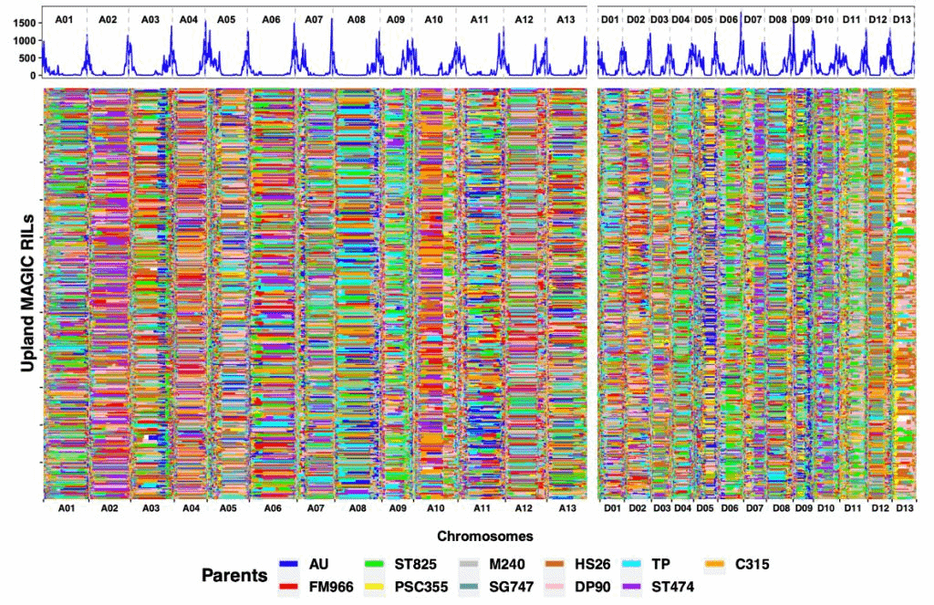 棉花是世界上最重要的天然纺织纤维来源。充分理解棉花纤维品质性状的遗传基础,加快选育优质的棉花新品种对棉花产业的可持续发展具有非常重要的意义。传统上,研究人员主要通过全基因组关联分析(GWAS)利用自然群体解析纤维品质性状的遗传基础。但由于自然群体存在明显的群体结构、未知的亲缘关系及普遍的低频功能变异,针对复杂性状的遗传定位效果并不理想。相较于自然群体,MAGIC群体没有这些劣势,能够有效地控制关联分析的假阳性。