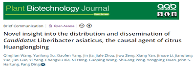 2022年2月,丁芳副教授为独立通讯作者在国际学术期刊Plant biotechnology Journal发表了题为“Novel insight into the distribution and dissemination of Candidatus Liberibacter asiaticus, the causal agent of citrus Huanglongbing”的研究论文,首次运用免疫原位杂交技术明确了柑橘黄龙病菌在寄主花器官内的存在,首次发现了黄龙病菌存在于花粉粒及萌发的花粉管中,并且可通过授粉过程扩散,该研究为柑橘黄龙病的传播和扩散提供了新的理论支撑,也为柑橘黄龙病的综合防控提供了新的理论基础。
