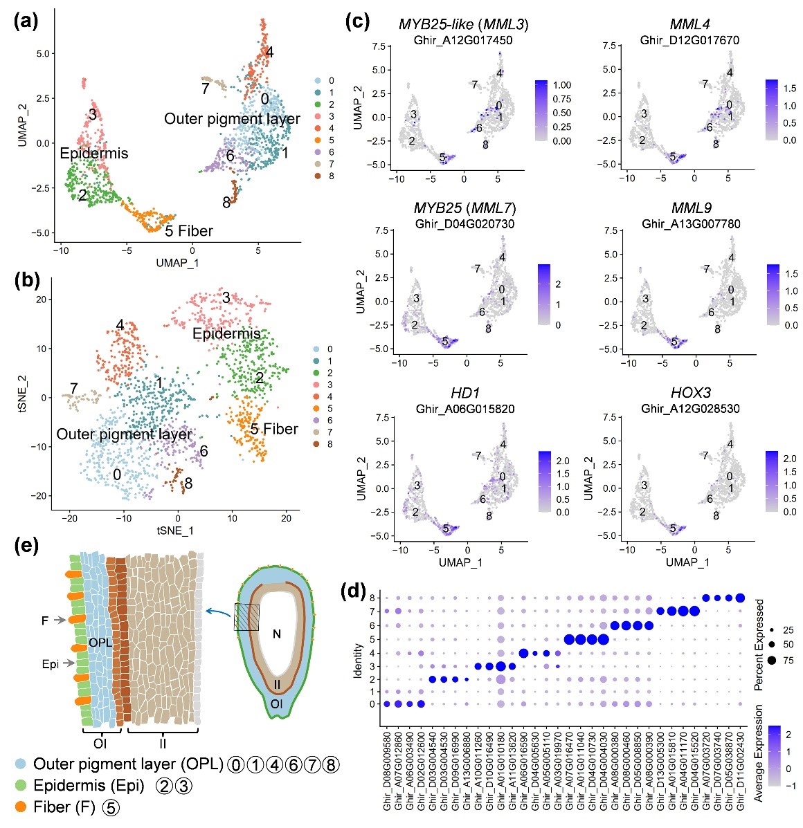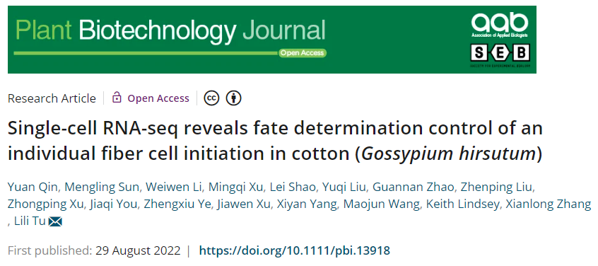 2. Qin Yuan, Sun M, Li W, Xu M, Shao L, Liu Y, Zhao G, Liu Z, Xu Z, You J, Ye Z, Xu J, Yang X, Wang M, Lindsey K, Zhang X, Tu L. Single-cell RNA-seq reveals fate determination control of an individual fiber cell initiation in cotton (Gossypium hirsutum). Plant Biotechnol J. 2022; https://onlinelibrary.wiley.com/doi/10.1111/pbi.13918