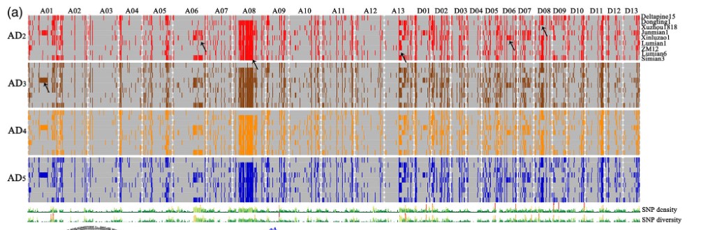 通过对1000多份棉花材料的进化分析,发现多年生海岛棉与野生-地方的海岛棉有较近的亲缘关系,可能直接来源于南美洲野生-地方海岛棉的引种。群体结构分析结果显示,一年生海岛棉大致可以划分为三个亚组,其中一个亚组只包含来自于中亚尤其是新疆的品种。通过比较Gb_M210936,3-79以及异源四倍体野生棉达尔文棉(G. darwinii),鉴定了大量的种内与种间变异,这些变异可能在海岛棉进化和驯化中起着重要作用。