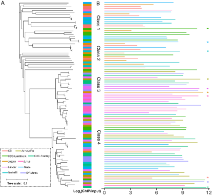 该研究以来自全球小麦育种计划的10+品系群体为对象,系统解析了每个材料着丝粒的定位和序列组成。研究人员捕获到小麦着丝粒重复序列、位置等存在大量变异,发现不同材料着丝粒存在广泛的重定位现象。在不同材料中均发现与着丝粒重要表观标记CENH3核小体紧密结合的重复序列是逆转录转座子Cereba,并且系统发育结果表明在不同小麦品系中Cereba转座子序列表现出较为一致的同质性,但结合程度较低的重复序列在每个小麦品系中表现出独特性,这意味着存在特定机制选择某些重复序列类型作为功能核心着丝粒的组成。此外,研究人员还观察到CENH3核小体在复杂的着丝粒重复序列(包括重新定位的着丝粒)上显示出较松散的DNA末端包裹,不同品系中严格的CENH3核小体占位和内在DNA序列特征在确定着丝粒功能方面发挥关键作用。这些结果表明,多种机制参与小麦10+基因组材料CENH3核小体的适应并稳定着丝粒功能。最终,研究人员提出在不同的基因组背景下着丝粒染色质具有明显的表观遗传可塑性,并且由于过去的育种选择,着丝粒的高稳健性对于维持小麦基因组稳定性至关重要。
