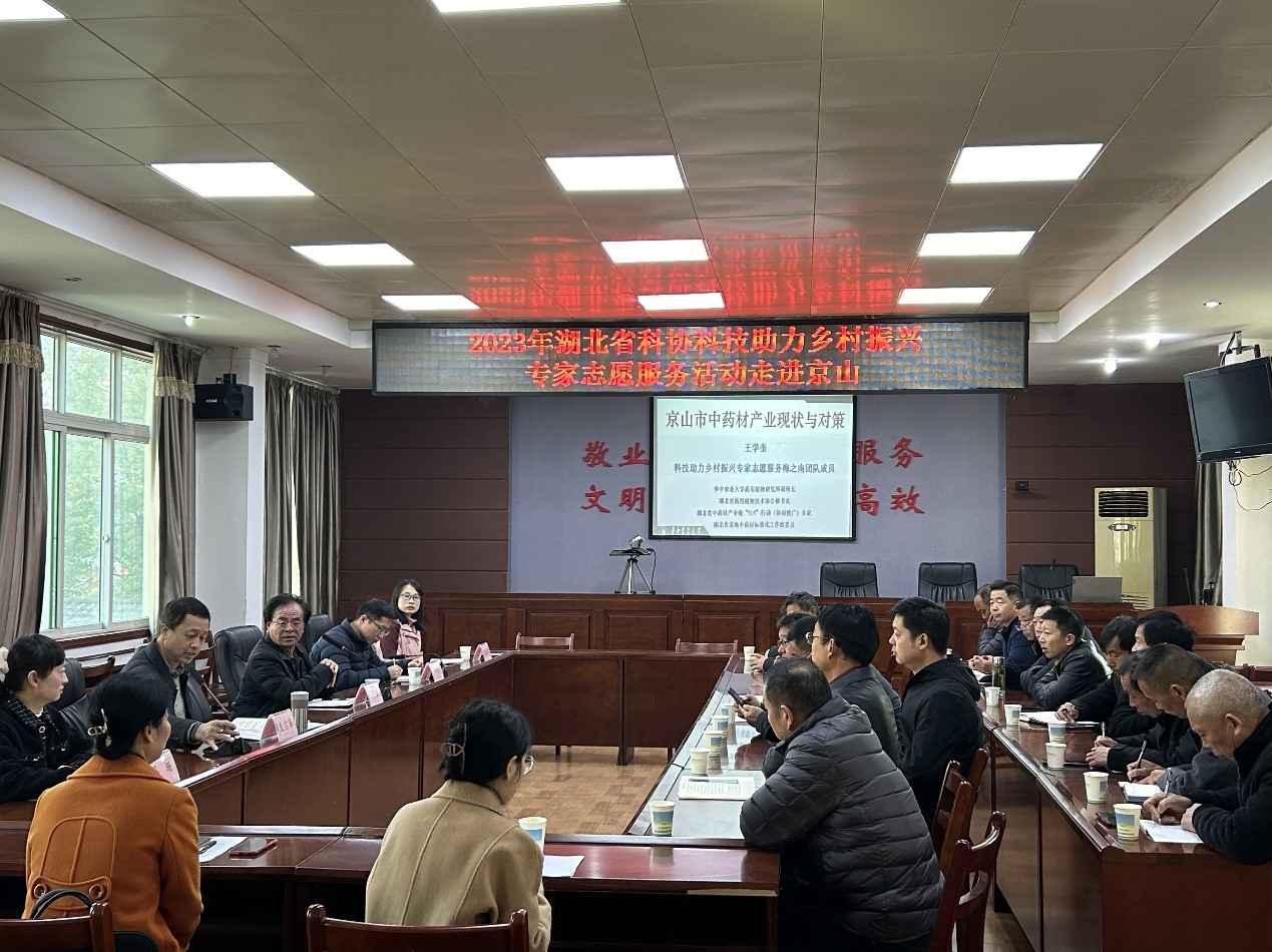 12月5日,省科协科技助力乡村振兴专家志愿服务梅之南团队成员,学院王学奎、尹昌喜副教授及药用植物专业研究生桑永慧等,应邀赴京山市为当地中药材产业发展献计献策,此次活动由京山市科协、京山市农业农村局共同组织。京山市科协党组成员、副书记袁宗泽、京山市科协党组成员晏珊、京山市农业农村局科教股长李朝贤、京山市科协兼职副主席、市农技推广中心高级农艺师李荣梅,及全市从事中药材产业的专业合作社负责人、种植大户代表以及涉及中药材生产的乡、镇、村书记等一同参加了此次活动。
