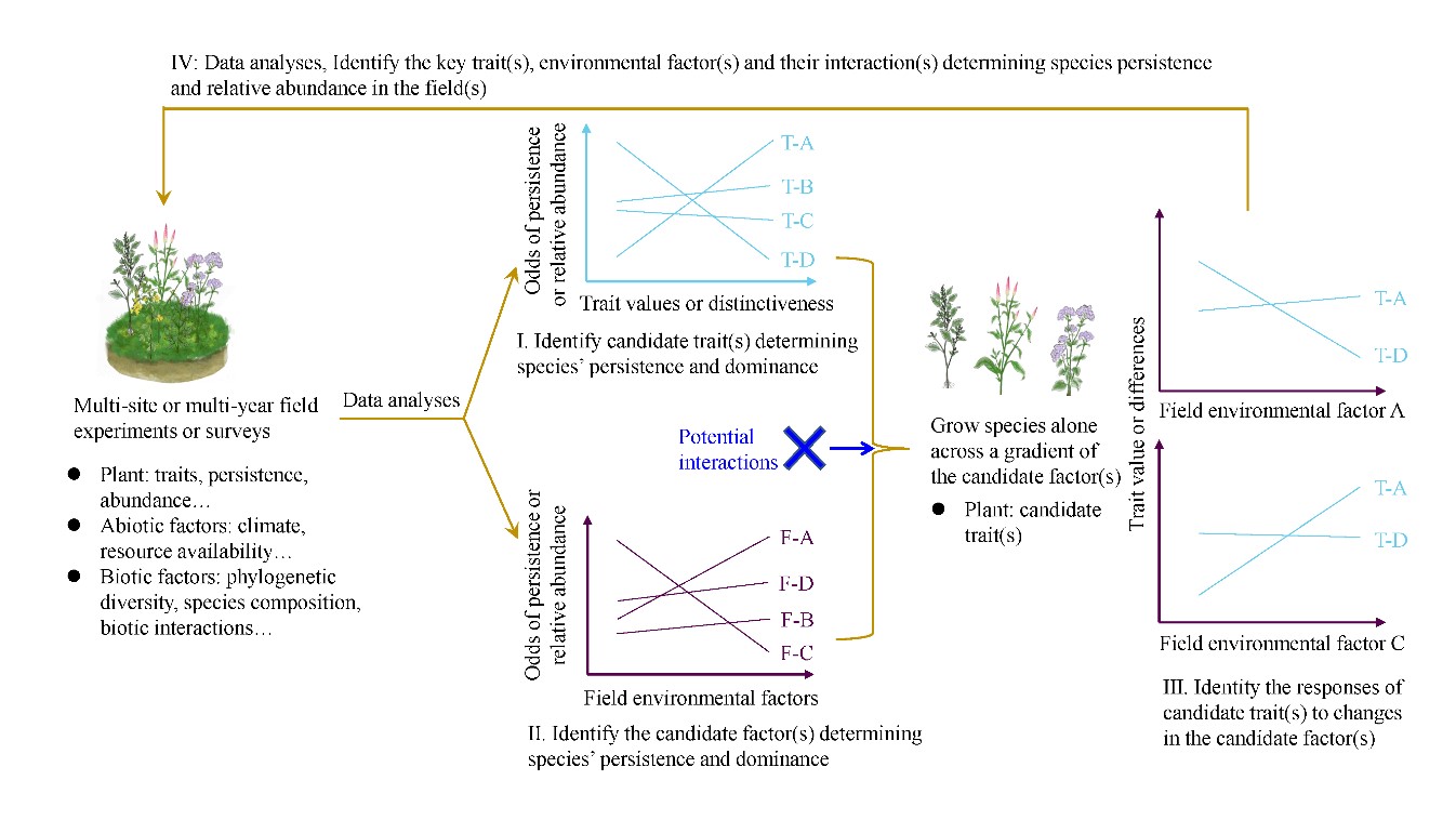 上述发现暗示现有研究框架难以准确剖析物种生物学性状和外来种入侵性的耦合关系,尤其是忽视了生物和非生物因子对两者耦合关系的影响。据此,课题组提出了整合多年多点的原生境调查和田间控制实验,探讨生物学性状和环境交互调控物种入侵和群落动态变化的新方法 (图1)。