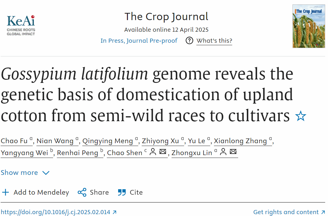 2025年4月14日,2138cc太阳集团棉花遗传改良团队林忠旭课题组在The Crop Journal在线发表了题为“Gossypium latifolium genome reveals the genetic basis of domestication of upland cotton from semi-wild races to cultivars”的研究论文。该研究通过从头基因组组装、比较基因组学分析、群体遗传学和泛基因组分析,揭示了光周期差异可能是阔叶棉从半野生小种中分化形成现代栽培种的重要原因之一。所鉴定的结构变异(SVs)及共选择区域共同促进了阔叶棉的独特驯化历程。