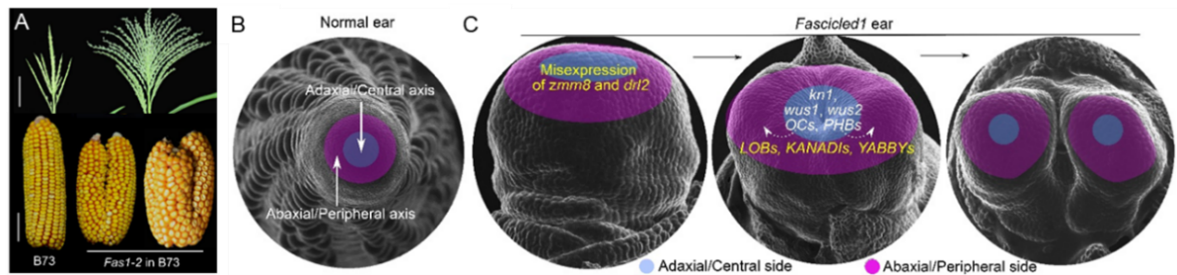 植物分生组织是一团自我更新的多能干细胞群体,通过固有模式持续分化产生侧生器官。辐射对称的花序原基如何产生不对称的侧生器官是植物发育生物学领域的共性科学问题。栽培玉米的雄花序有一个主轴和多分枝,雌花序只有一个穗轴、无分枝。Fas1是一个雌、雄花序无主轴、多分枝的显性突变体。研究发现,该位点的基因重排导致了MADS-box 家族转录因子zmm8和YABBY家族转录因子drl2的拷贝数增加,并由此产生新的启动子使得zmm8和drl2在花序分生组织原基异位表达,通过下调分生组织中心轴基因的表达抑制中部细胞增殖,同时上调外围轴基因的表达促进外围细胞增殖,最终形成花序主轴缺失、分枝增多的雌、雄花序。该研究结果说明了花序分生组织原基中严格的基因时空表达模式的重要性,也为基因拷贝数变异影响花序发育提供了新证据。