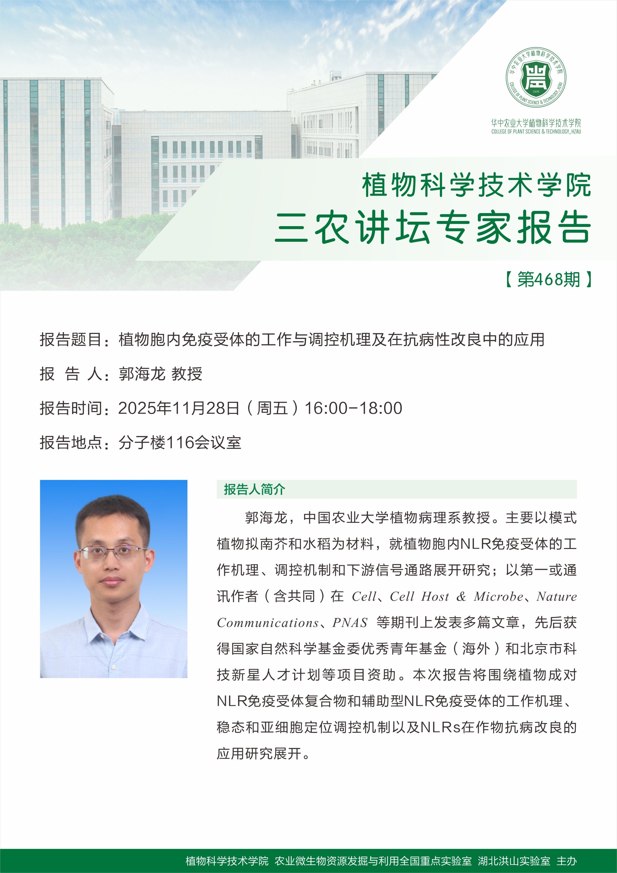 植物胞内免疫受体的工作与调控机理及在抗病性改良中的应用(郭海龙 教授)