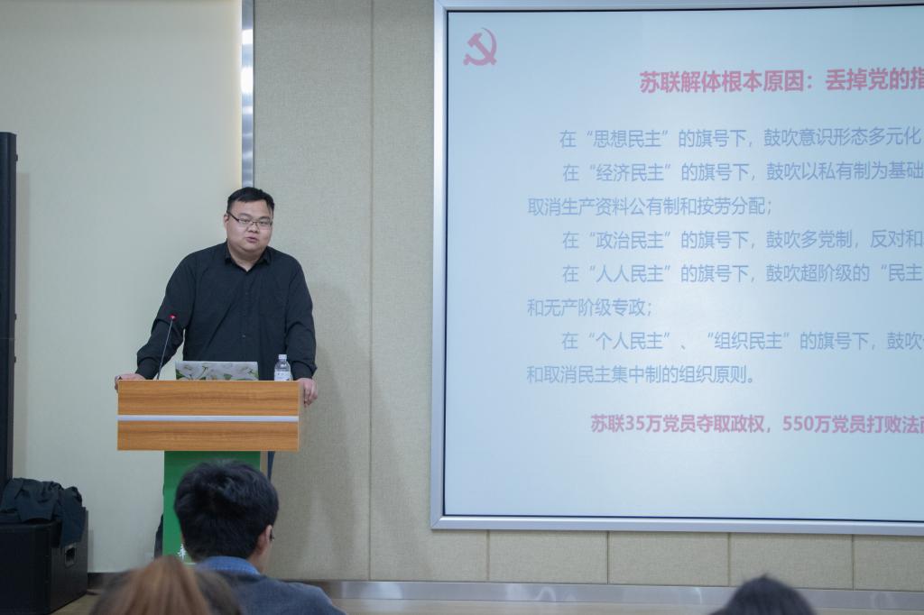 “思想是行动的先导,理论是实践的指南”,谭力铭首先强调了思想引领的重要性。他以苏联解体为例,从历史和实践的角度阐述了正确指导思想的重要性,随后,谭力铭针对中国共产党的指导思想作了详细介绍。马克思主义是在工业革命时期,工人阶级的剩余价值被残酷剥削的背景下诞生的,其理论体系主要包括:马克思主义哲学、马克思主义政治经济学、科学社会主义。“党的指导思想需满足不同时期需要,与时俱进”,谭力铭讲道列宁主义从实践上更新了马克思主义,而毛泽东思想则是马克思列宁主义在中国的运用和发展,谭力铭阐述了不同阶段党的指导思想的创新性发展