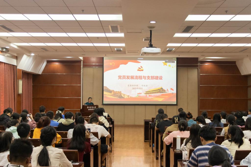 付兆佳围绕党员发展流程、党支部建设管理等内容,对本研学生支部支委进行党务知识培训。“每个党支部都应该要标准化、规范化建设。”付兆佳着重对发展党员工作进行了阐述,从申请入党到预备党员的教育考察和转正,发展党员的每个阶段都有明确的步骤和程序。她提到,入党积极分子的培养考察是发展过程的重点,培养联系人可以通过谈心谈话、观察判断等方式对入党积极分子进行考察。在发展对象的确定和考察阶段,要注意培养时间的要求,政治审查需要结合具体情况进行考量。付兆佳以预备党员接收大会为例,强调了支部大会的重要性,并向大家详细解释了支部大会需要遵循的三个原则以及注意事项。