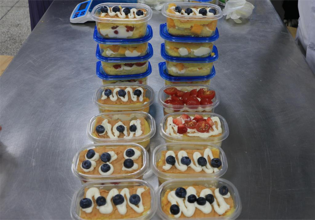 活动伊始,食品科学技术学院荣建华老师介绍了海绵蛋糕和麻薯的制作方法及烘焙工具的使用,并对制作流程进行了详细讲解。听完讲解,现场的老师们随机组成了六个小组,以小组为单位进行了蛋糕和麻薯的制作。大家相互配合,配备材料、搅拌、抹坯到烘烤出炉,再将蛋糕切块,充分发挥创意,精心用水果和奶油点缀,最后制作成了一盒盒漂亮精致的小蛋糕。随后,在烘培老师的指导下,老师们又成功制作出了麻薯。现场,老师们不断相互交流制作要领,关心制作进度,充满欢声笑语,气氛十分热烈,空气中都弥漫着香甜的味道。