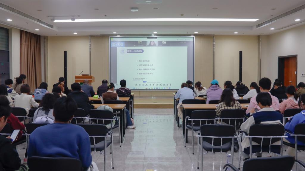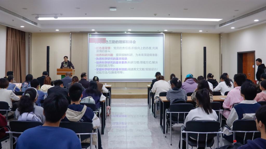 会议伊始,陈小林“如何做科研和科研笔记”为主题展开解释了自己对红色三助计划的理解与感悟,指出该计划旨在发挥党员的先锋模范作用,引领同学们尽早接触科研领域,为未来深造奠定坚实基础。随后,陈小林展示了科研记录本的正确记录方法,鼓励参与红色三助计划的同学们要科学规划时间、培养良好习惯、勇于面对失败,不断积累经验。
