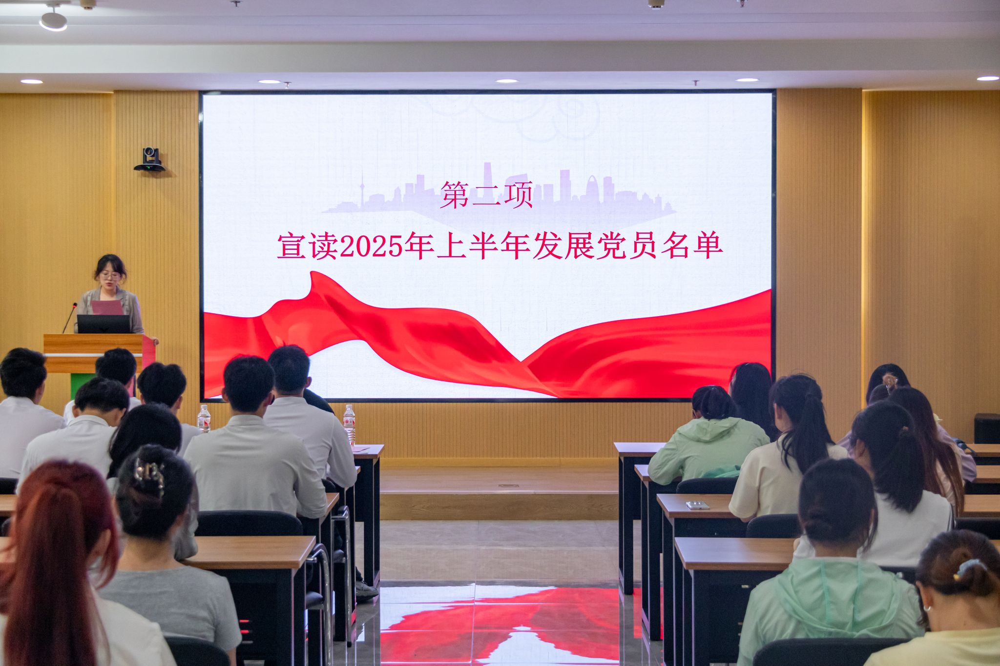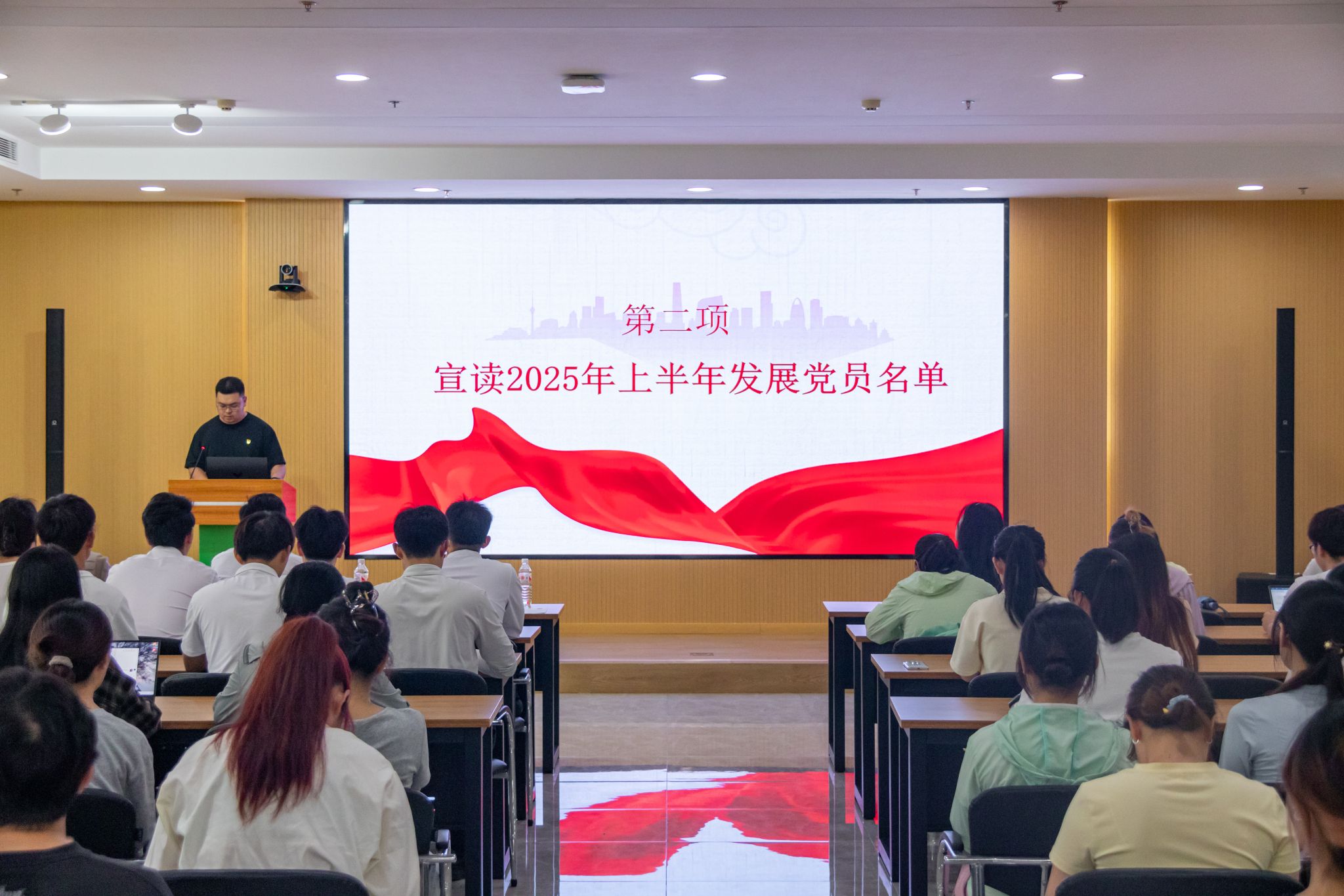 任伟、马恬远分别宣读了2025年上半年本研新发展党员名单。紧接着,全体党员在党员代表任伟的带领下庄严宣誓,誓言铿锵有力,饱含着新党员对党忠诚、为共产主义奋斗终身的坚定决心。