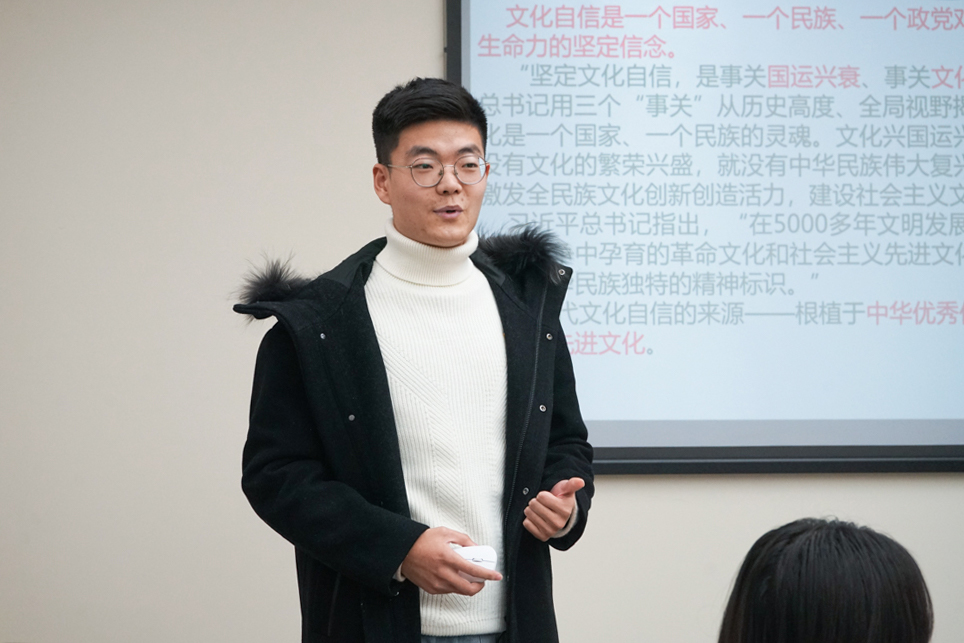 学院团委副书记申璐以“筑起文化自信的长城”为题,从宏观方面对文化自信做了分享。她讲道:“我们大学生在思想上,要厚植文化自信,增强战略定力;在实践方面,要做好文学艺术创作和革命文化教育的工作,做到守土有责、守土负责、守土尽责。”