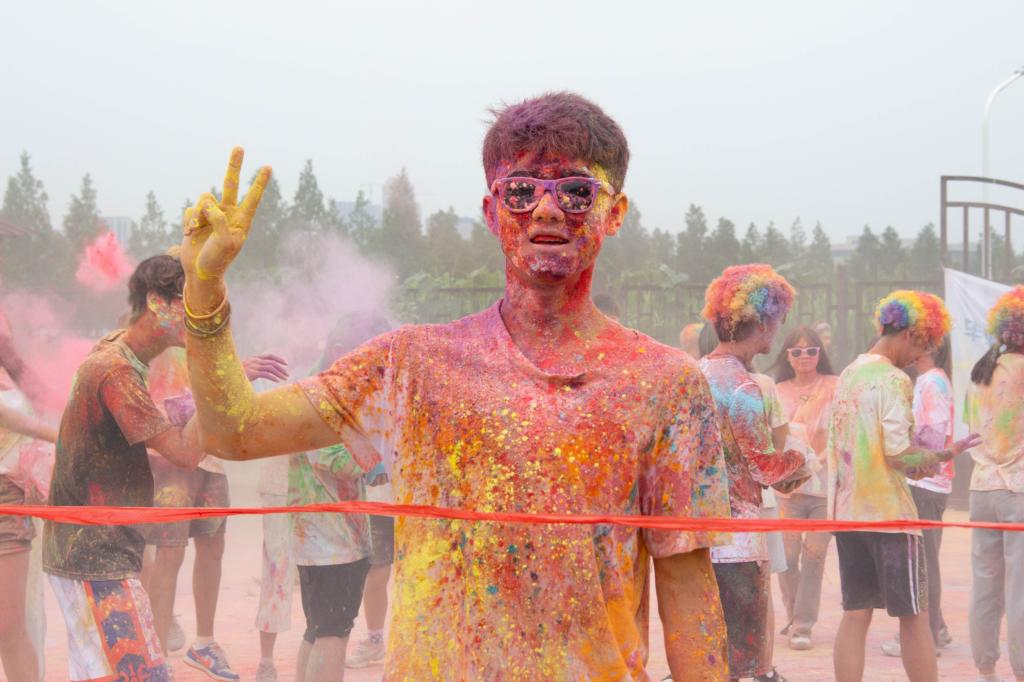 随着彩虹跑的进行,同学们陆陆续续到达终点。在这里,他们首先在海报背景布上签下自己的名字,接着逐一领彩虹粉末。随着跑团团负责人陈芳瑛一声令下,本届彩虹跑最令人期待的部分——“彩色大战”一触即发。伴随着激昂而欢快的音乐,同学们或头戴彩色爆炸头,或佩戴彩色墨镜,纷纷将自己手中的彩色粉末洒向他人。缤纷的玉米粉有些在空中散开,又四处飘落在“参战人员”的头发上、脸上、衣服上;有些则被“毫不留情”地砸向同学们的白色衣服上……到最后合影时,所有参加彩色大战的同学都仿佛被彩虹上了色,在镜头前定格下青春最绚丽肆意的模样。