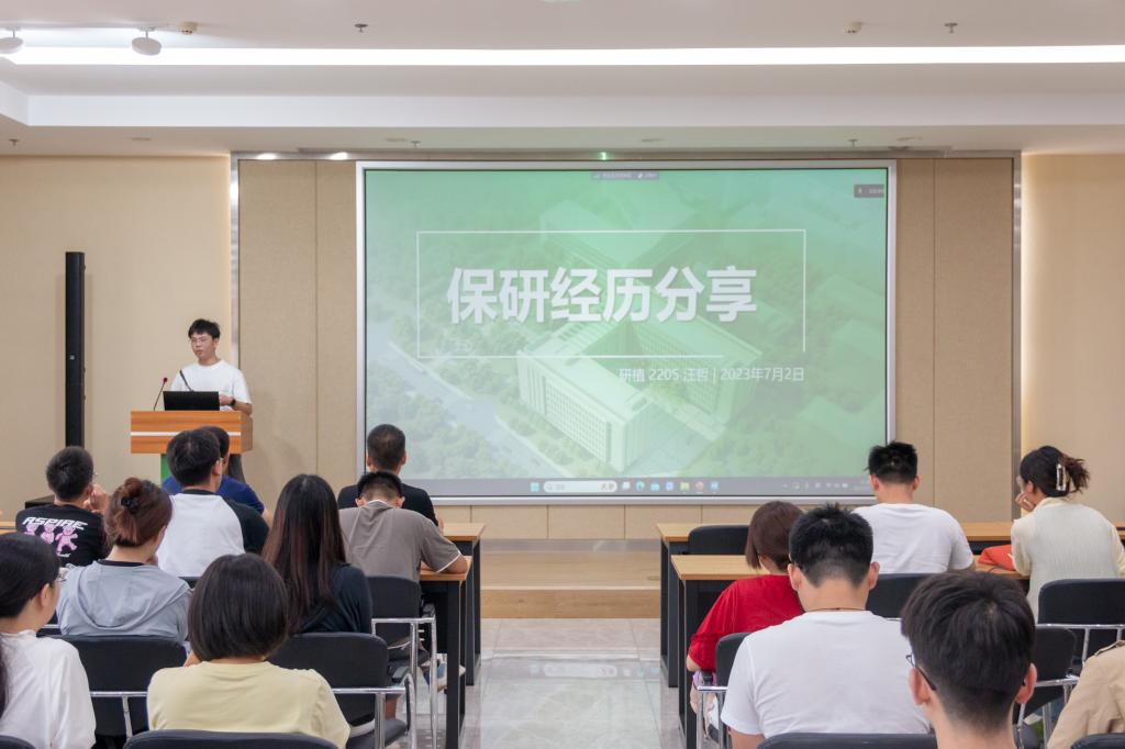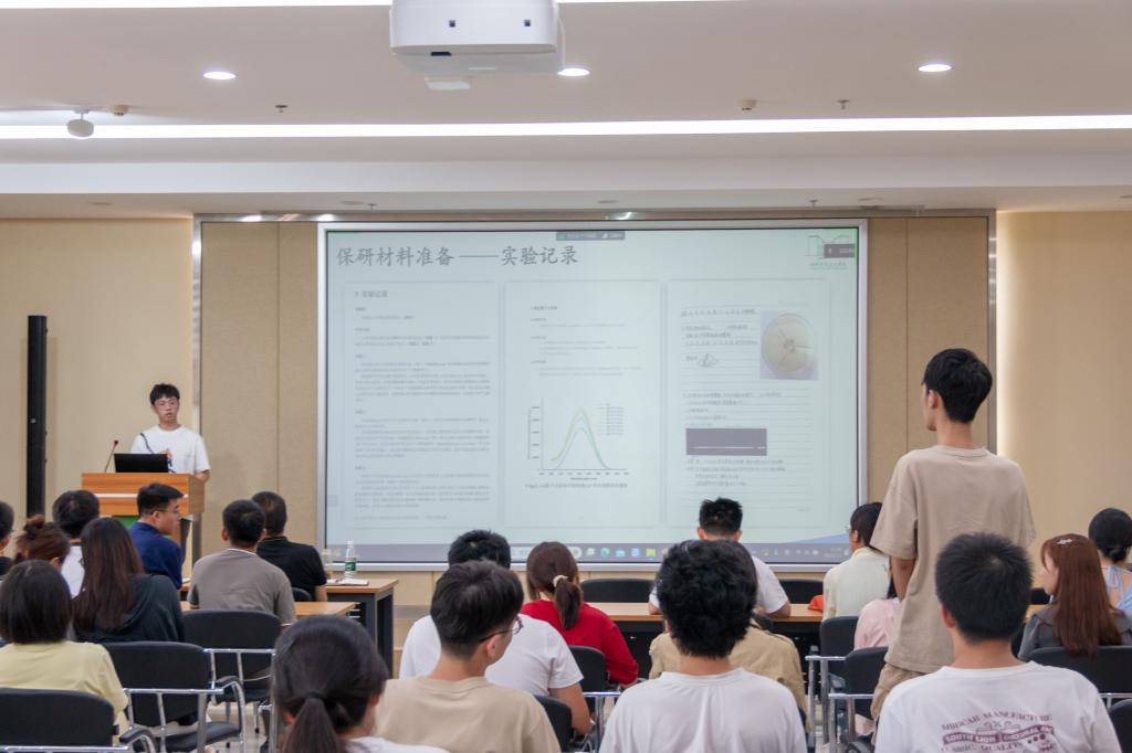研植2208班汪哲向同学们分享了他的保研经历。他对自己本科经历、科研经历进行简单的介绍后,详细地为同学们分析解读了今年保研政策的变化与重点,着重强调了保研材料的准备方法,包括封面、目录、试验记录、推荐信以及奖项证明等,着重突出了保研材料准备的重要性。