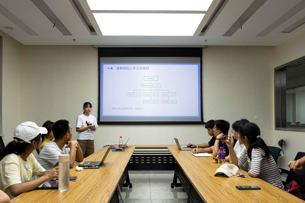 会上,主持人介绍了本次暑期期间负责人组成结构及其负责的各项工作与要求,重点强调了各位负责人在暑期期间对于在校人员的安全工作事宜。辅导员练人杰补充道:“各位的工作重心就是保证班级同学在学校暑期生活的安全问题。”他提醒留校负责人们要摸排好在校人员的流通情况,注意信息的及时反馈,做好暑期留校期间的安全工作。