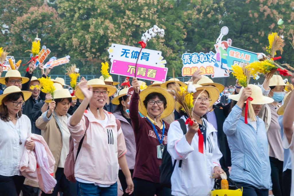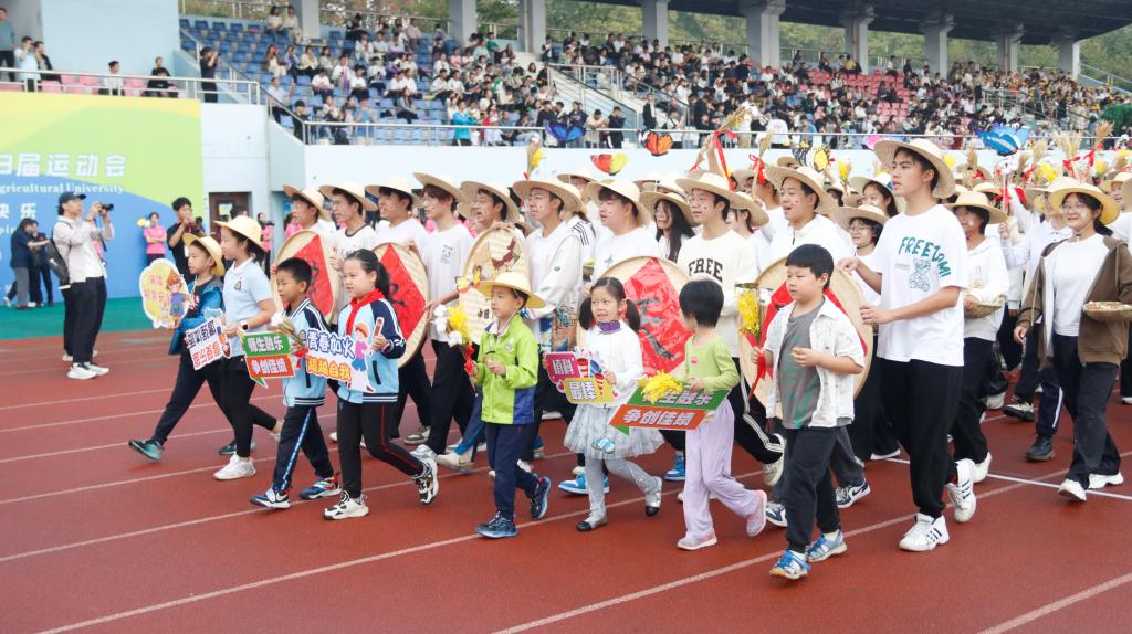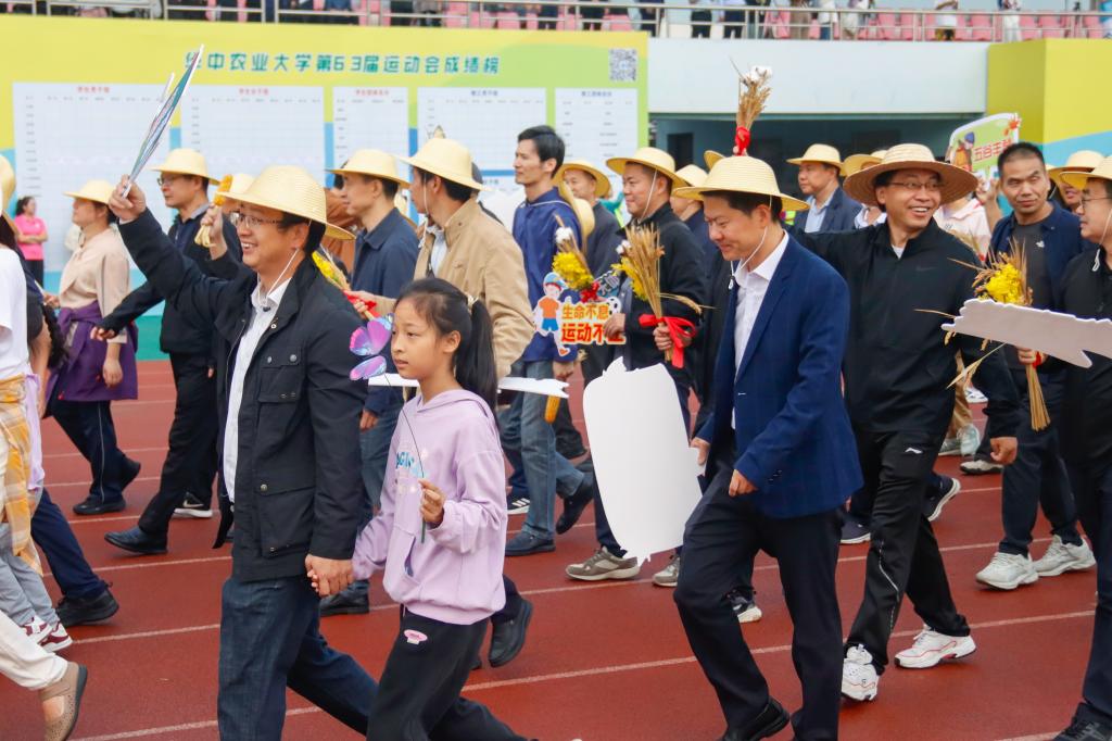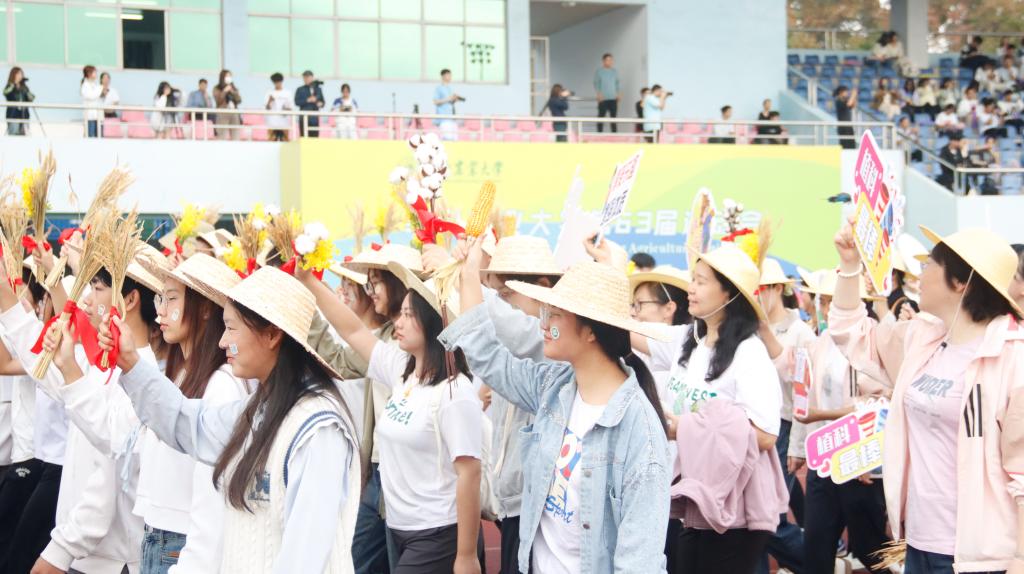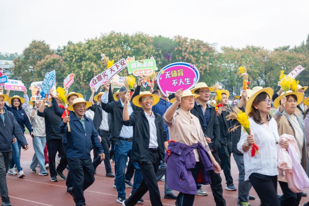 “五谷丰登,粮安天下!勇往‘植’前,势不可挡!”早操方阵之后,我院师生入场方阵在引导员的引领下,踏着铿锵有力的步伐,缓缓步入运动场。方阵成员手持书有“粮安天下”的毛笔字的圆形簸箕、以“种子画”制作而成的中国地图和油菜、水稻、小麦、棉花、玉米、大豆、蝴蝶等各式特色手持物,头戴草帽,它们不仅生动展现了植科院的鲜明学科特色,更深刻表达了师生们对农业的深厚情感。方阵成员以饱满的热情和高昂的斗志,昂首挺胸走过主席台,口号响亮,精神饱满,彰显出植科院师生团结一心,锐意进取的坚定信念。