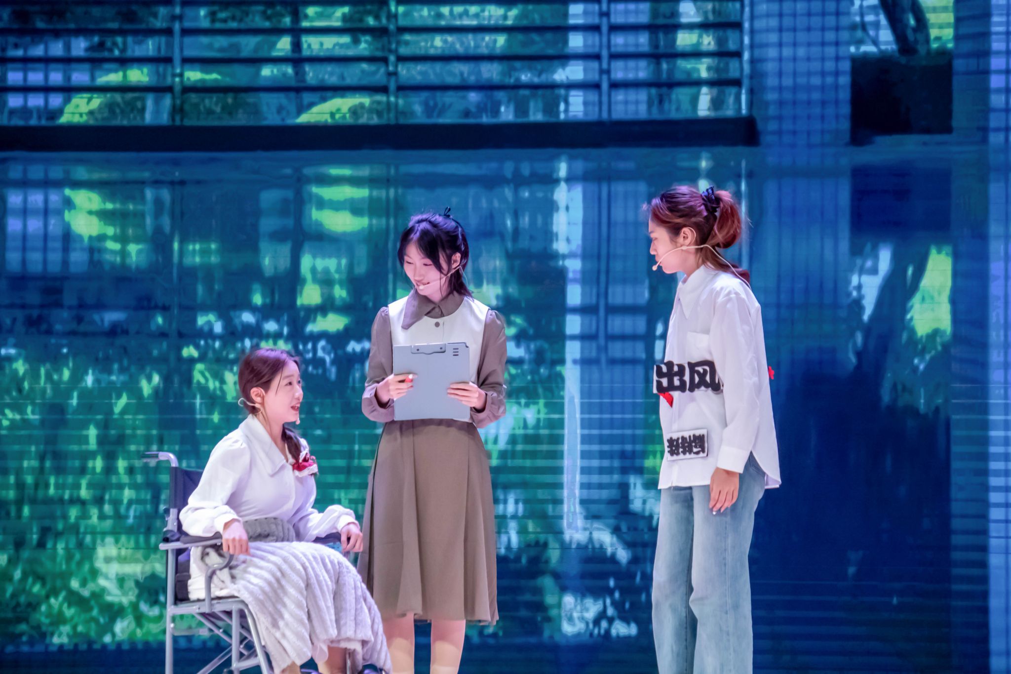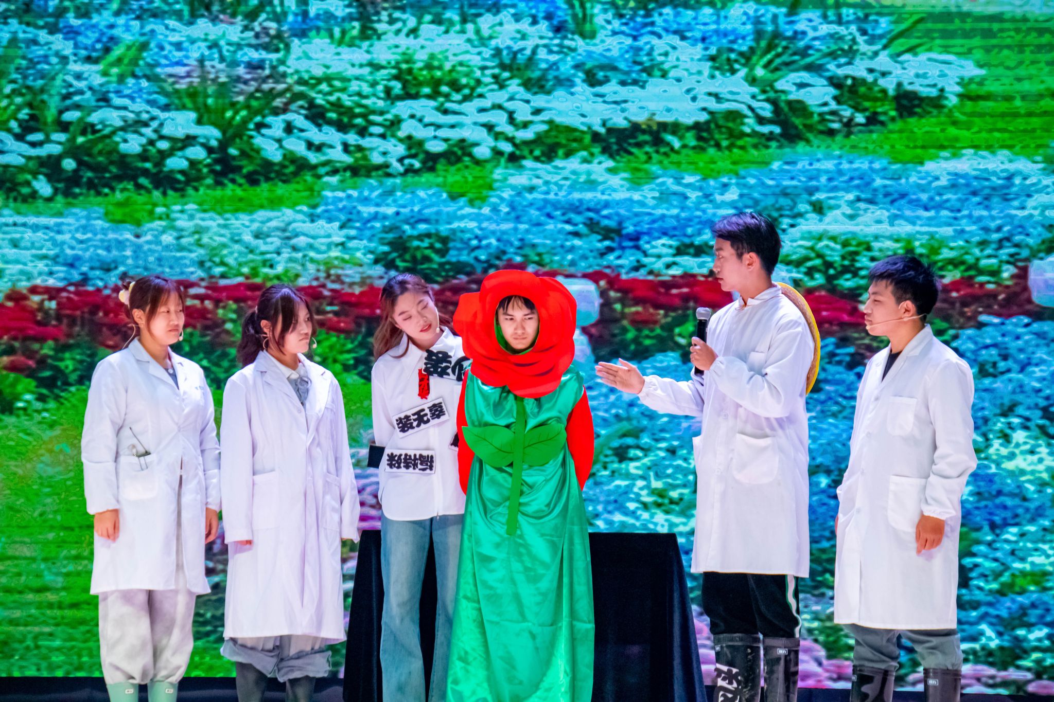 我院原创剧目《我?》以失忆学生南柯为主角,通过虚实交织的叙事手法,深刻探讨自我认知、外界评价与成长救赎的主题。剧中,南柯因失忆陷入身份困惑与“标签大乱斗”,作为残障通道项目核心推动者,她虽被誉为“校园英雄”,却因抄袭争议与团队矛盾备受质疑。旁人的冷嘲热讽与自我怀疑化为具象化的“幻听幻视”,令她在标签迷宫中挣扎。最终,在心理咨询师的引导下,南柯直面内心创伤,接纳真实自我,领悟“前行自有光芒,绽放无需观众”的成长真谛。剧中以玫瑰花为意象,传递生命的意义不在于他人评判,而在于活出自我的积极内核,引发观众强烈共鸣。
