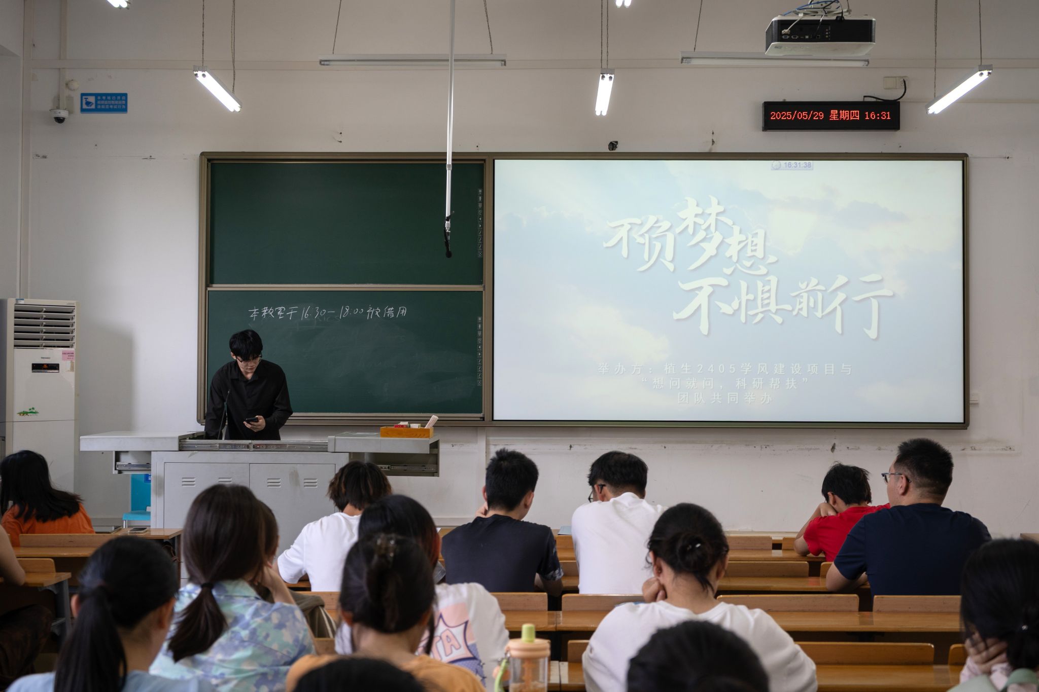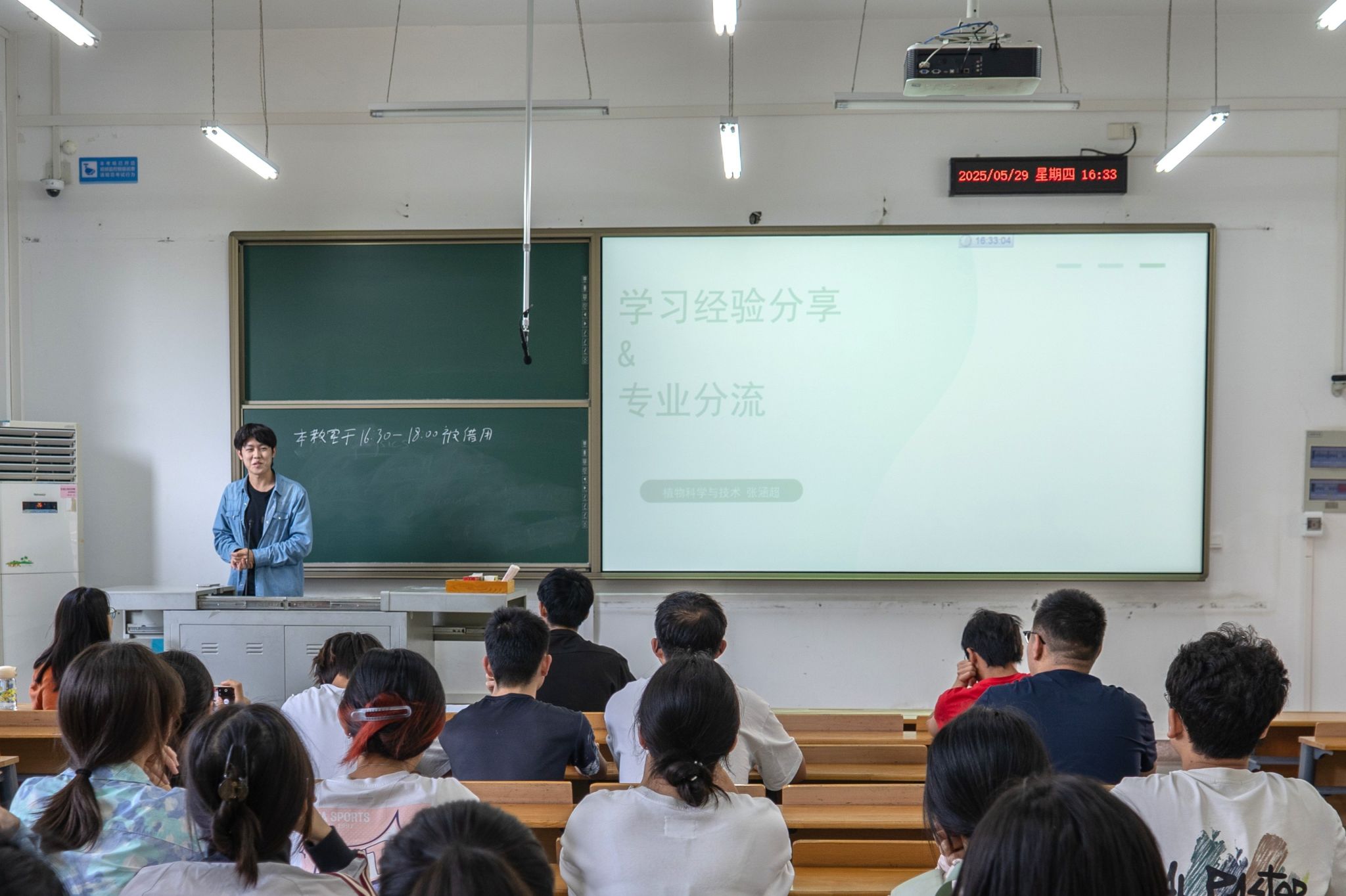 5月29日晚,2138cc太阳集团植生2405班在四教A108教室举办“朋辈领航”经验分享会,邀请种工2201班李英、植科2201班张涵超、应生2201班朱书峰分享学习经验,约50位24级学生参与活动。
