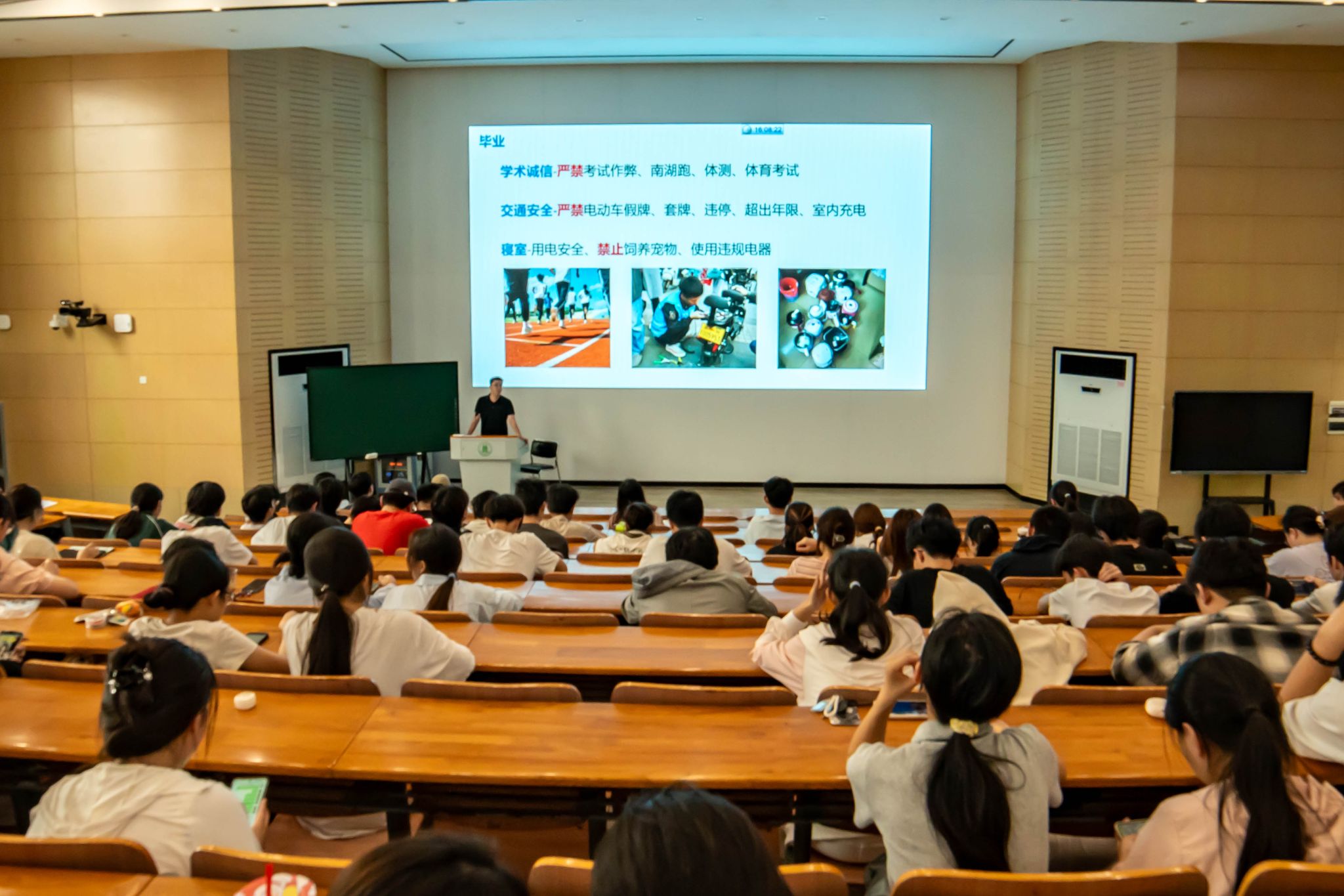 在“毕业”部分,练人杰强调学习是学生的中心任务,各位同学要学会独立思考、审慎发言,恪守学术诚信,注意人身安全、财产安全、身体健康与心理健康。随后,他结合真实案例,特别提醒同学们重视电动车安全,提高防诈骗意识。