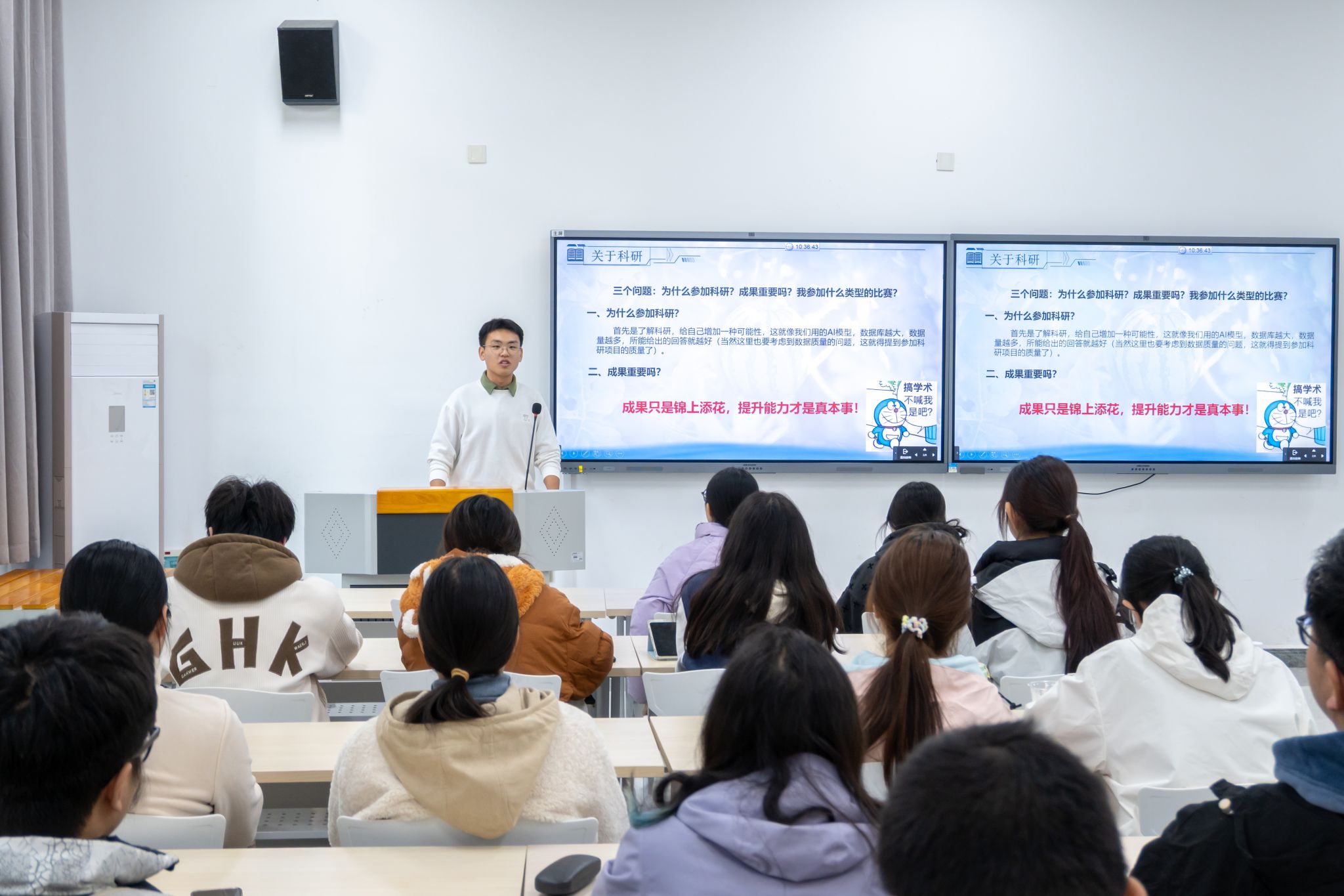 在科研探索方面,王永康围绕“为何参与科研、成果是否重要、如何选择竞赛”三个核心问题展开。他将科研经历比作AI模型的数据积累,强调“数据库规模与质量决定未来可能性”,指出科研的核心价值在于拓宽学术视野、突破认知边界。针对“唯成果论”误区,他提出“成果是锦上添花,能力提升是根本”,引导同学们理性看待科研价值。竞赛选择上,他建议优先参与教育部认可的权威赛事如全国大学生生命科学竞赛、“挑战杯”及学校SRF项目,此类赛事评价规范、认可度高且能获得系统指导。他特别强调“要主动争取负责人角色,更要肩负责任”,鼓励同学们在实践中锤炼担当意识。