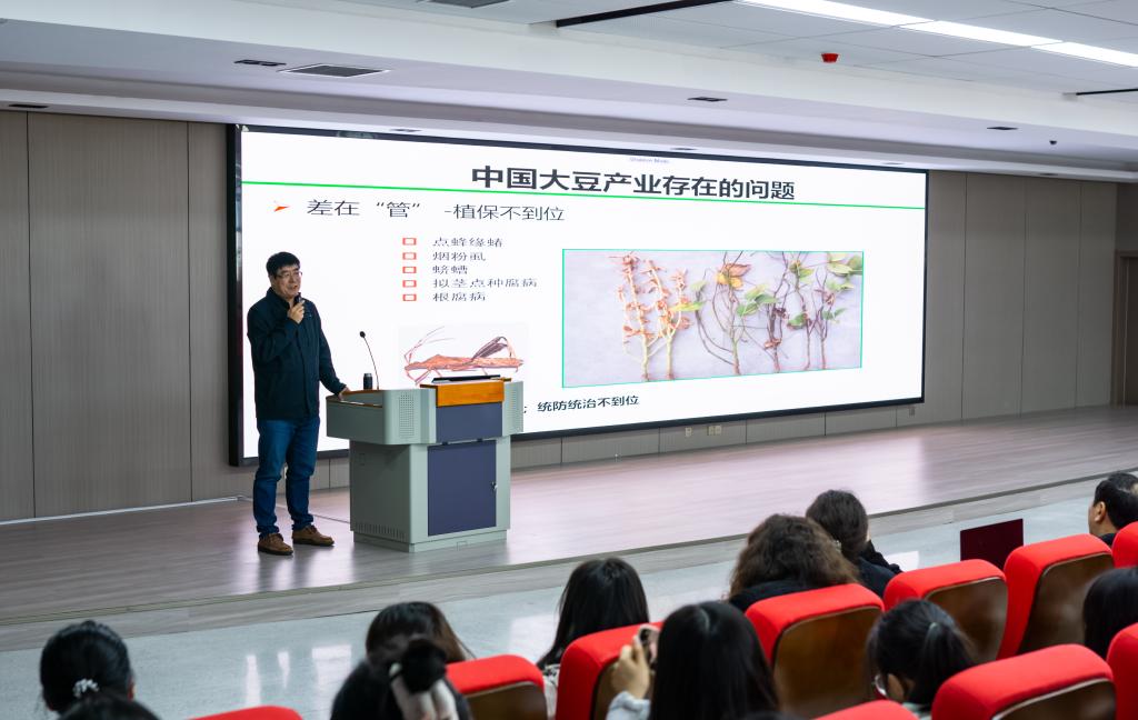 “我们的工作要点是保好苗、治好虫、浇好水、收好籽。”吴存祥研究员用通俗易懂的语言向同学们描述他的研究和国家大豆产业技术岗位的工作内容。他从我国多地大豆播种的自然条件出发,向同学们介绍了如何理解大豆的出苗过程;以一种典型害虫的发现和防治故事展示了科学防虫的重大价值;讲述了如何通过综合改良种子和农业机械确保出苗率和收获率。他强调,随着科技的不断发展,中国大豆生产无人化作业将越来越普及。通过智能育种、精准施肥、智能灌溉、实时监测病虫害、智能收割等技术推动中国大豆乃至整个农业的持续发展。