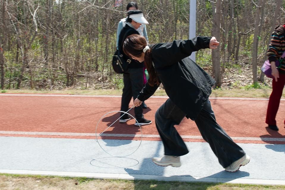 “科普互动”“趣味运动”“解谜拍照”是本次狮山长走的三大亮点。游春路线上,不仅设置了补给点开展自然科普问答互动游戏,还设有滚铁环、投壶、踢毽子、筷子运输乒乓球等趣味运动,为这场长走活动增添了别样的欢乐。此外,活动开始时,各队伍获得了五条有关地点的短句谜语,通过解谜定位具体地点,在相应场景进行拍照可获得额外纪念品。