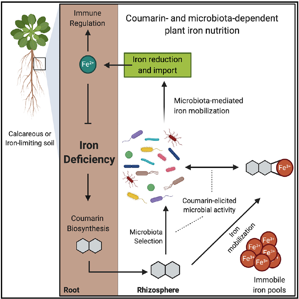 报告中,Schulze-Lefert教授团队发现在缺铁环境下,拟南芥根系分泌香豆素可以改善根际微生物种群,从而促进铁的吸收。研究人员发现香豆素的合成对缺铁环境下的植物生长及根际微生物的组成至关重要。人工重建代表性根际微生物群落(SynCom)能够恢复野生型植株在缺铁条件下受抑制的生长状态,但对Fe3+还原及Fe2+吸收突变体fro2、irt1以及f6’h1、s8h及pdr9(香豆素合成和运输突变体)无效,表明植物中与scopoletin和fraxetin合成及分泌相关的基因也是根际微生物群落应对植物缺铁所必不可少的。通过比较转录组学分析表明众多与缺铁响应、铁稳态调控与运输、离子运输等相关基因的表达量在缺铁条件下生长的f6'h1突变体中受到诱导,而与是否添加SynCom无关,表明植物是通过分泌香豆素从而激活微生物介导的铁活化过程而缓解铁缺乏的,而不是通过改变微生物群落及通过香豆素直接起作用的。