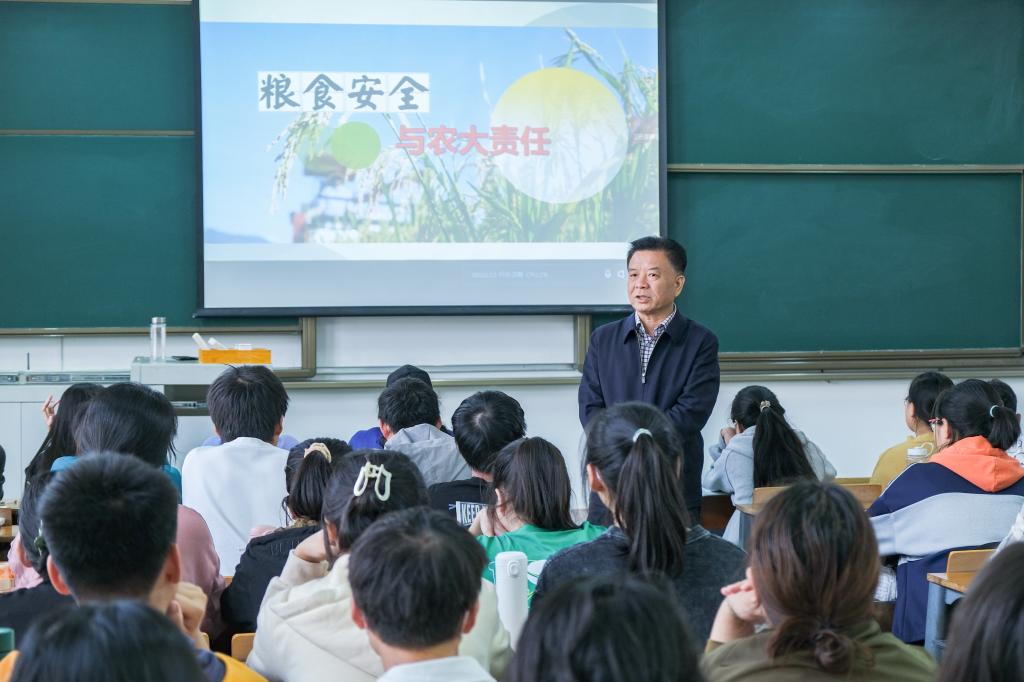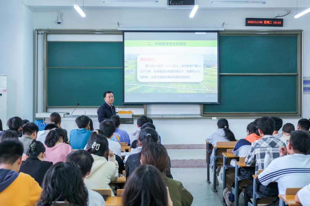 11月8日下午,校党委副书记、副校长姚江林为我院2022级学生讲授形势政策课。姚江林以“粮食安全与农大责任”为题,围绕粮食安全的内涵、中国粮食安全的现状、粮食安全面对的危机、中国农业科技创新现状以及农大学子的责任和使命五个部分进行讲述。