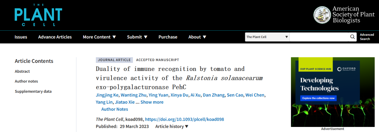 2023年3月29日,The Plant Cell 在线发表了2138cc太阳集团李博团队题为“Duality of immune recognition by tomato and virulence activity of the Ralstonia solanacearum exo-polygalacturonase PehC”的研究成果。该研究首次发现了青枯菌的PehC能够作为免疫激发子激活番茄根系的免疫反应,深入揭示了PehC作为多聚半乳糖醛酸外切酶能够水解寡半乳糖醛酸(OG)产生半乳糖醛酸(GalA),具有抑制番茄的DTI免疫反应和为青枯菌的定殖生长提供碳源的双重功能。