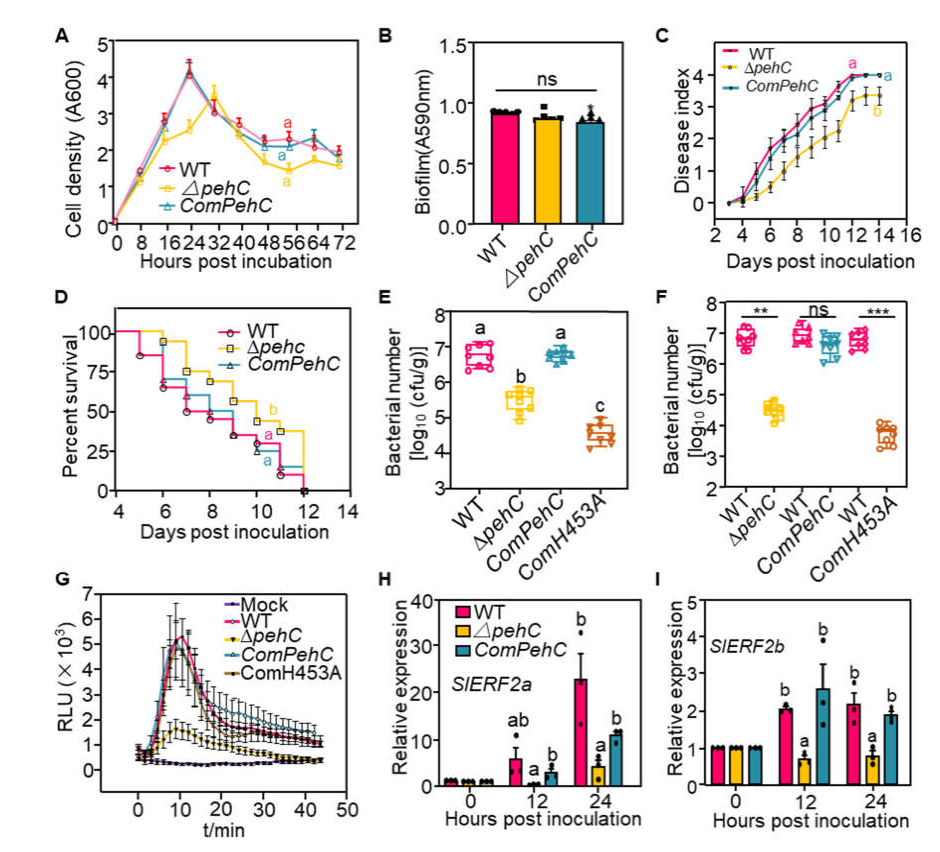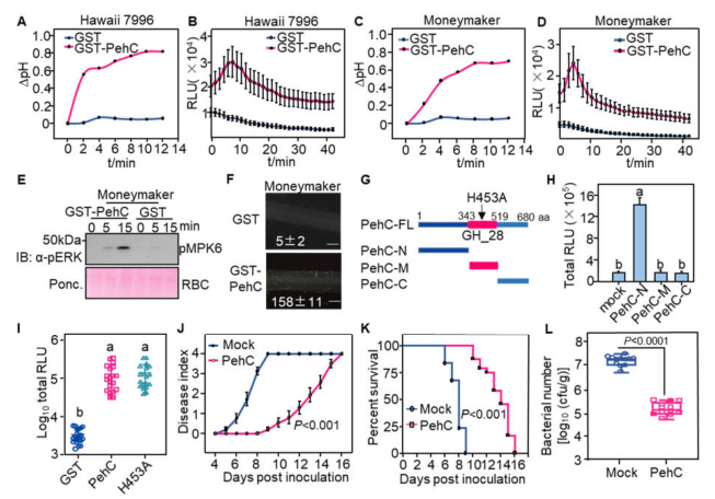 接下来为了进一步研究PehC在青枯菌侵染中的生物学功能,作者在GMI1000菌株背景下构建了突变菌株ΔpehC以及突变体背景下回补野生型PehC和酶活位点突变PehC H453A菌株,检测不同菌株对番茄致病性和诱导免疫反应的差异,发现ΔpehC菌株致病力和诱导免疫反应的能力均显著减弱,ComH453A菌株致病力减弱而诱导免疫反应能力没有变化(图2),说明PehC对于青枯菌的毒力及其在番茄木质部的生长是必需的,并且可能在番茄与青枯菌互作中发挥着其他的生物学功能。