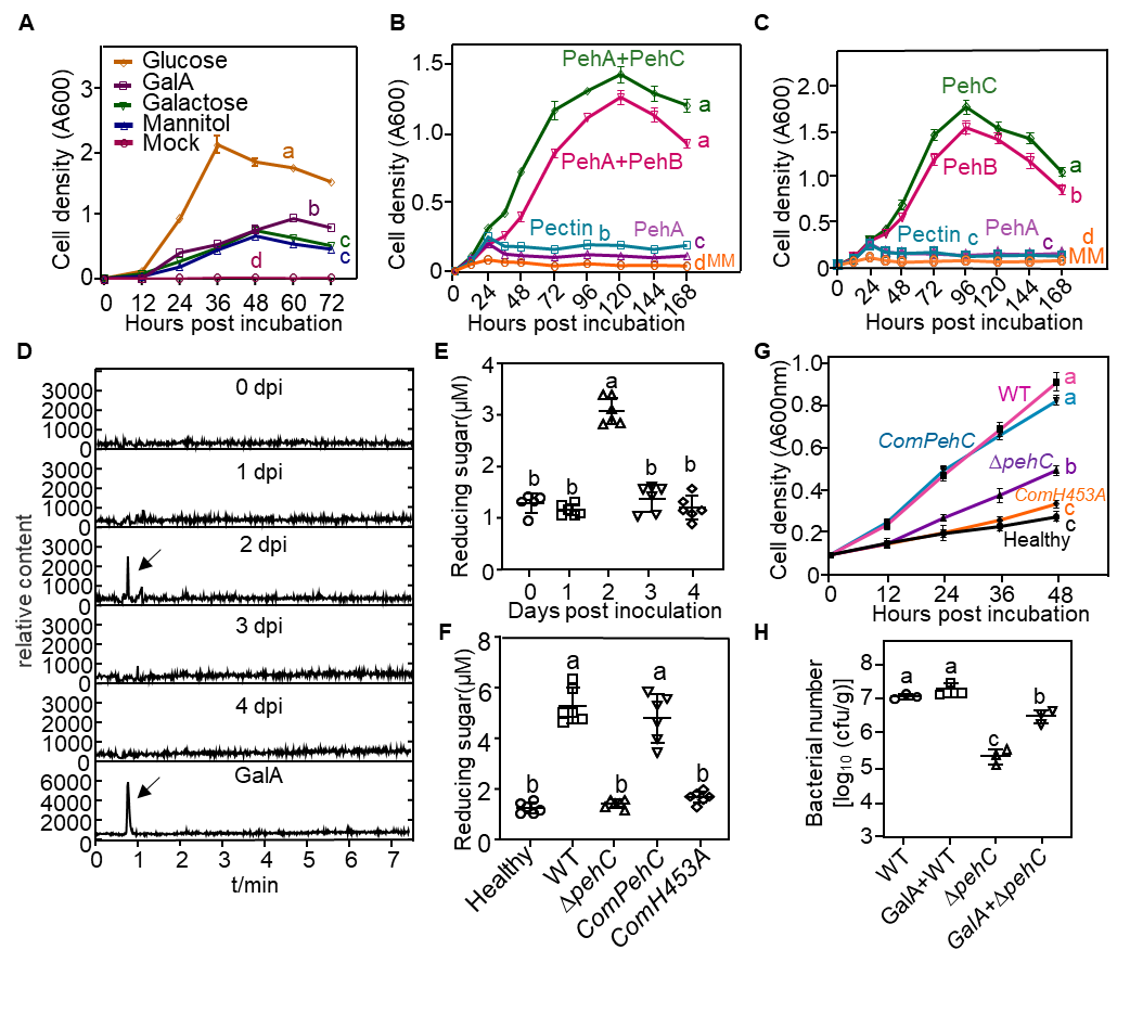 为了验证这种可能性,作者检测了PehC作为多聚半乳糖醛酸酶外切酶的酶学活性,发现PehC可以进一步水解青枯菌侵染过程中产生的果胶降解片段OGs释放出半乳糖醛酸GalA,从而抑制损伤相关的分子模式DAMP--OGs触发的番茄DTI免疫反应(图3)。同时作者发现GalA在青枯菌侵染早期可以作为碳源被利用,从而促进其在木质部的定殖和生长,是一种微生物适应机制,进一步拓展了PehC在番茄与青枯菌互作中的生物学功能。