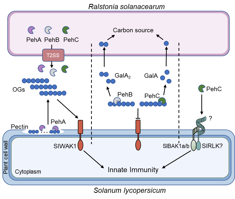 基于以上研究结果,作者提出了PehC 在青枯菌侵染中发挥多重功能的工作模型:在侵染过程中,青枯菌分泌PehA水解寄主植物细胞壁的重要成分果胶,生成OGs。OGs作为一种DAMP,可被植物细膜表面受体WAK1识别并触发DTI。为了逃避这种识别,青枯进化出PehB和PehC来降解OG,生成二聚体GalA2和单体GalA。这些单糖可以在侵染早期作为碳源被青枯菌利用,帮助其在木质部中定殖和生长。同时为了抵抗青枯菌的入侵,番茄进一步进化出了RLK类型的模式识别受体来识别PehC,激活PTI免疫(图4)。该研究提出了番茄与青枯菌共同进化的模型,为植物与病原菌之间的军备竞赛提供了新的模式。
