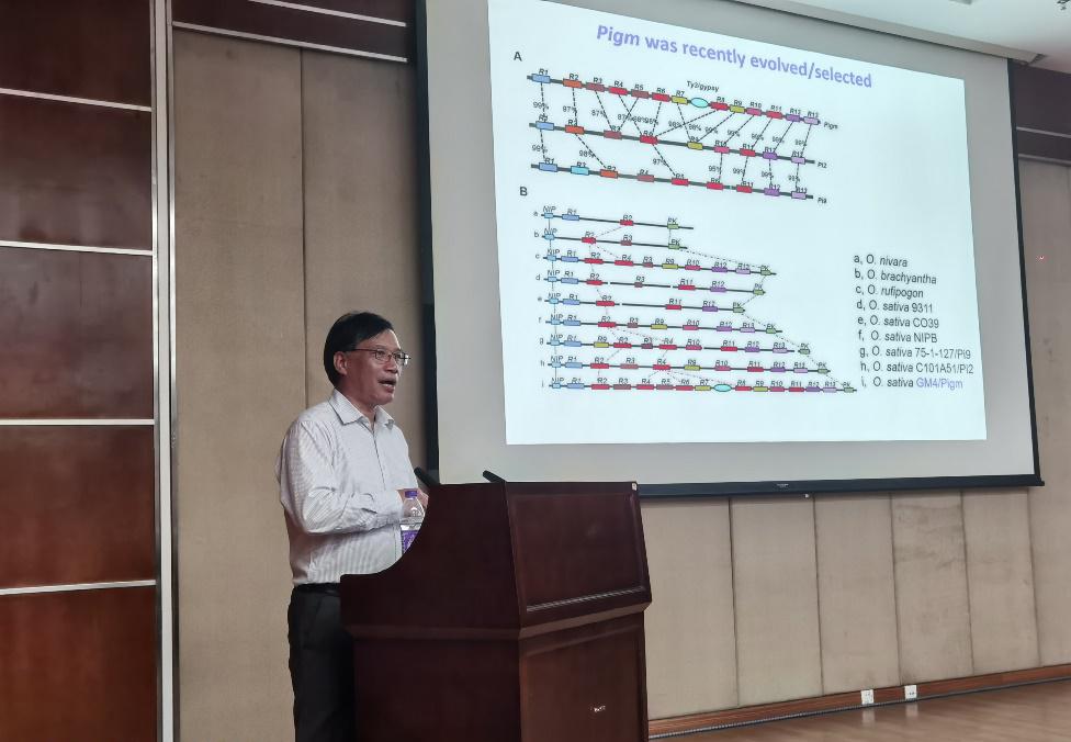 何祖华研究员首先介绍了其团队在水稻“癌症”稻瘟病抗性基因及其分子机制方面取得的一系列研究进展。稻瘟病对世界水稻具有毁灭性危害,但广谱与持久抗病的问题一直无法解决。其研究团队通过多年研究发掘了一个广谱抗瘟位点Pigm,研究发现其编码两个序列相似但功能拮抗的受体,两者受到表观遗传的调控,既保证了水稻对稻瘟病菌的广谱抗性,又克服了高抗与低产之间的矛盾,发掘的抗病基因已被广泛应用并大面积推广。为了深入探究Pigm广谱抗病的机制,其研究团队发现了Pigm可以通过转录激活、代谢调控以及活性氧产生等信号途径达到广谱抗病,鉴定了一系列的关键调控组分,在作物中解析了一种全新的植物免疫和广谱抗病机制。报告中他强调了植物免疫系统基础抗病和专化抗病性在植物抵抗病原菌侵染中协同调控的重要性,其团队进一步尝试在水稻中创造性的重构广谱抗病,利用团队新克隆的白叶枯抗病基因Xa46通过不同方法与早期克隆的基础抗病基因Xa21整合后发现可以重构广谱抗性,这为植物抗病基础和应用研究提出了新的理念。
