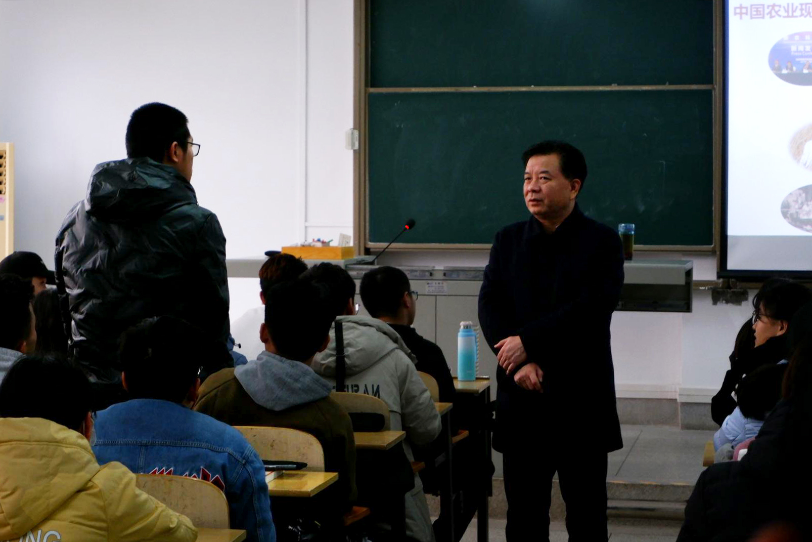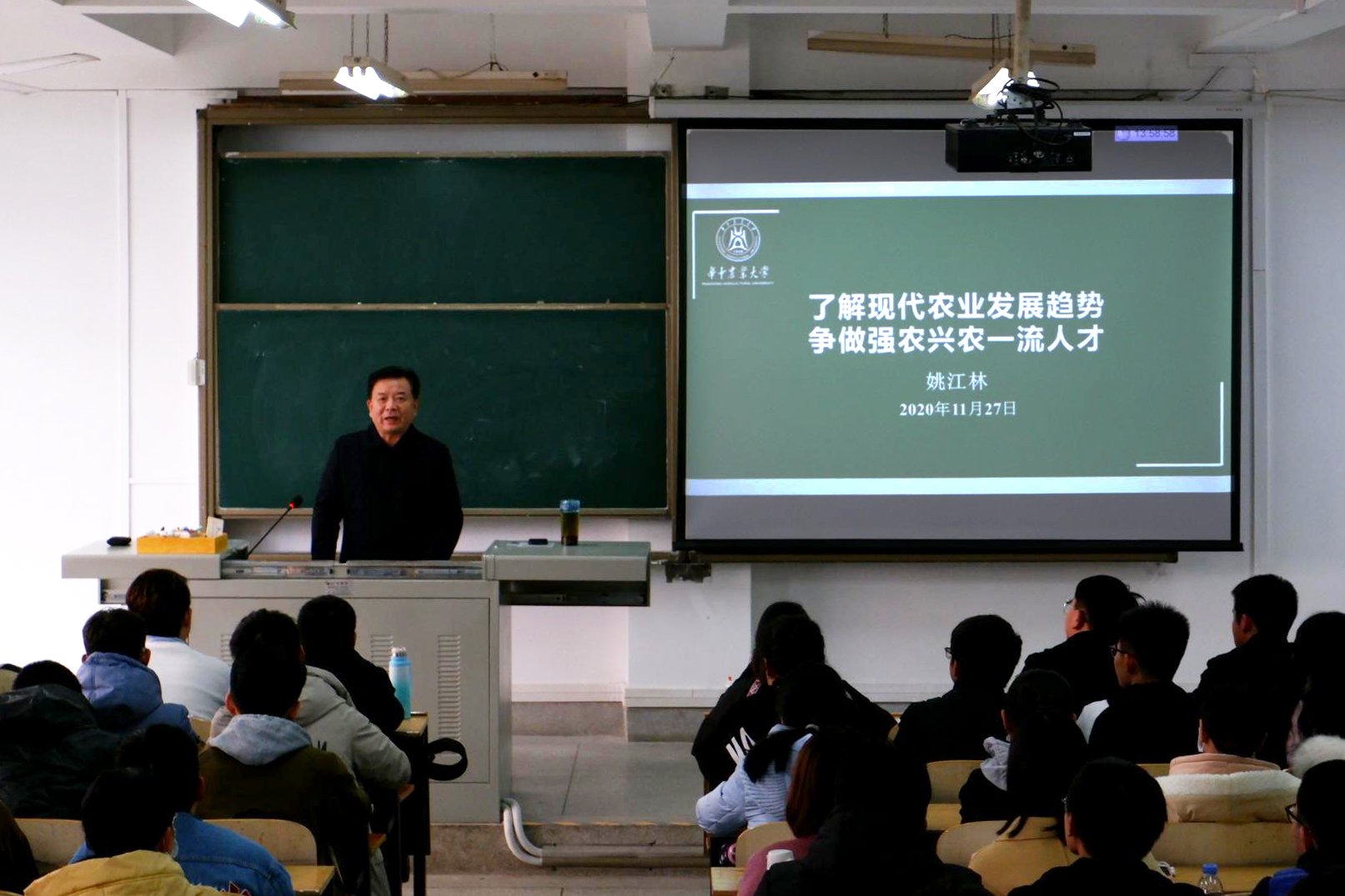 姚江林为同学们阐述了现代农业的特征以及与传统农业的区别,让同学们对现代农业有了更系统更全面的了解。当谈到现代农业的发展趋势时,姚江林表示,绿色农业是现代农业发展的必然趋势,农业信息技术推进现代农业转型升级,人类营养与健康需求推动农业产业供给侧改革,农业组织创新催生生产力和生产关系新变革。他提出随着农业现代化进程的不断推进,对于农业人才的素质和要求也是在不断提高。