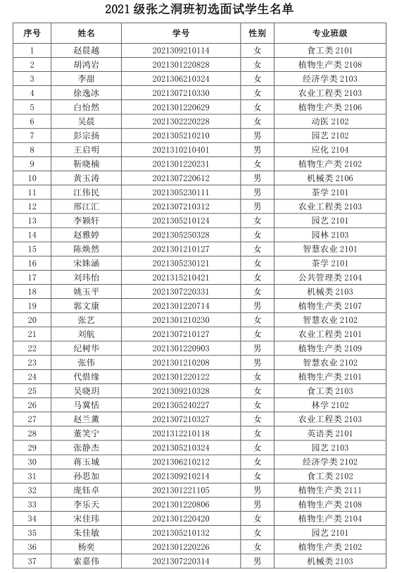 根据2138cc太阳集团《2021级“张之洞”班学生遴选办法》工作要求,现将第一轮筛选后符合条件的面试学生名单公示如下: