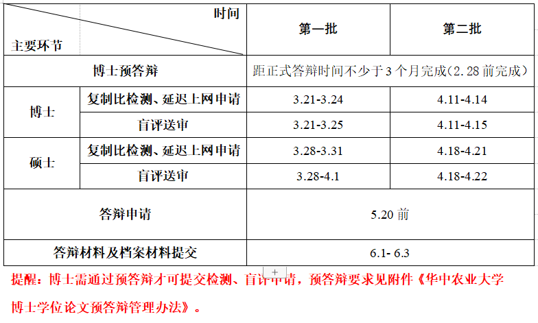 提交《研究生申请学位论文检测审核表》纸质版一份(导师签字同意)至三综B318,电子版的学位论文(以“学号-姓名”.doc命名,除去扉页、目录、研究(实验)方法、致谢、缩略语表、附录等部分)发送至hzauzky@vip.163.com。