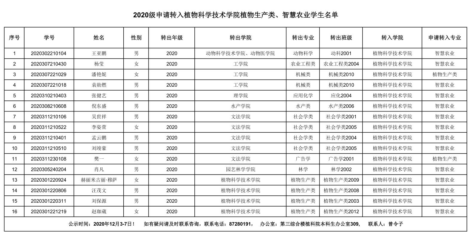 2020级申请转入2138cn太阳集团城植物生产类、智慧农业学生名单