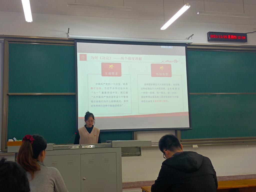 紧接着,刘娟同志以一串数字密码“4135101”为线索挖掘两个《决议》的重要内容与精神,解读“为何《决议》、《决议》为何、《决议》如何、我们何为”四个层次带来的思考。“13个方面的历史性成就”中以全面从严治党、文化建设、生态文明建设为例展开分析,通过我国抗击新冠疫情的实践分析“10个坚持”中蕴含的历史经验,她表示,再出发,中国共产党人自信自强、团结一心、奋斗不息、风华正茂,结合党中央的号召落实到我们每一个大学生党员来说,我们要自觉学习中国特色社会主义新时代的新理论新思想,树立不负人民的家国情怀、责任担当,增强自身专业知识技能、自我管理技能,融入到国家的未来发展中,为祖国和人民办实事,百年奋斗,再起新程。