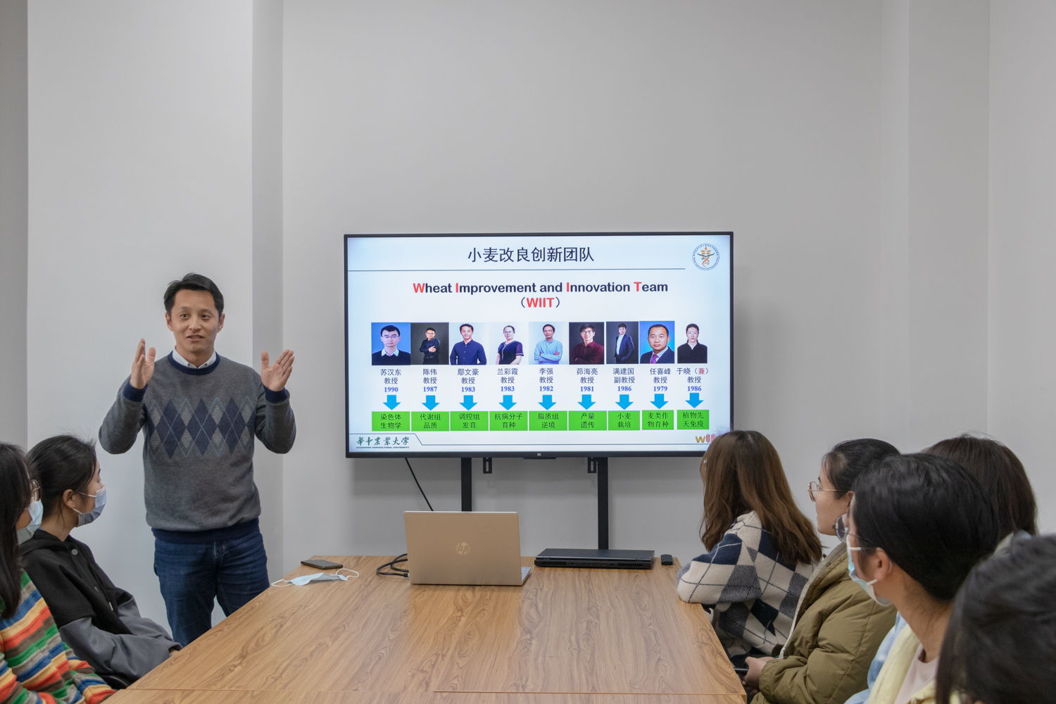 活动伊始,鄢文豪为同学们回溯了我校小麦研究的历史,并详细介绍了现今小麦团队的组成,展望了科研之路的未来。在介绍这支新起之军时,他激情澎湃、斗志昂扬地讲道:“作为一个年轻的,思想活跃的团队,我们有信心会在未来给同行一个惊喜。”紧接着,鄢文豪向同学们依次介绍了小麦团队的成员及其对应的研究方向,从曾经是最年轻的陈伟教授到90后教授苏汉东,“年轻”“实力派”“思维高度活跃”“团结”无疑是这支队伍最鲜明的代名词。此外,他还为同学们详细地介绍了小麦产业链和小麦团队的研究平台,引得同学们一片心驰神往。谈及科学研究,他指出,未来的科研应该是以个人兴趣与国家需求为双重导向的,相辅相成之下才会成就更好的未来。