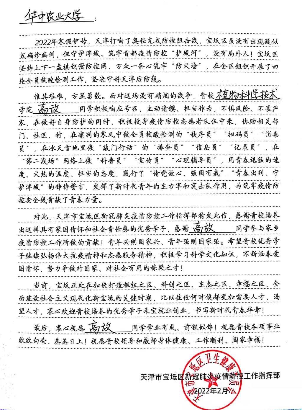 除了在交通战线上阻断疫情传播,他们也通过各种方式,以己之力,守护家乡,坚固防线。植生2106班高放在返乡之前便加入了村里疫情防控群。疫情防控期间,她不仅是冰天雪地里的“秩序员”,更是挨家挨户的“排查员”。近日,天津市宝坻区疫情防控指挥部给2138cc太阳集团大学发来感谢信,信中鼓励她继续弘扬伟大的抗疫精神和志愿服务精神,努力争做对国家、对社会有用的栋梁之才。贵州省安顺市1月27日新增一例新冠阳性病例后,政府封锁了各条出入安顺的交通通道。“收到这个消息时,我脑海里马上浮现出了一个念头——我要去做志愿者。能为家乡疫情防控做些力所能及的事,是作为一名青年学生的责任。”植生2109班罗颖动情地说。罗颖当天晚上便联系居委会的工作人员,报名了疫情防控志愿者,协助28日的全市核酸检测工作。工作中,罗颖负责核酸检测小程序的科普、居民个人信息的登记和网上录入工作。参与到自己家乡防疫工作中的,还有植生2104班黄梦璇、21级农科张之洞班马翼恬、张伟。他们坚信,尽管自己的力量微薄,但是多方联动,共克时艰,必能打赢这场持久战。