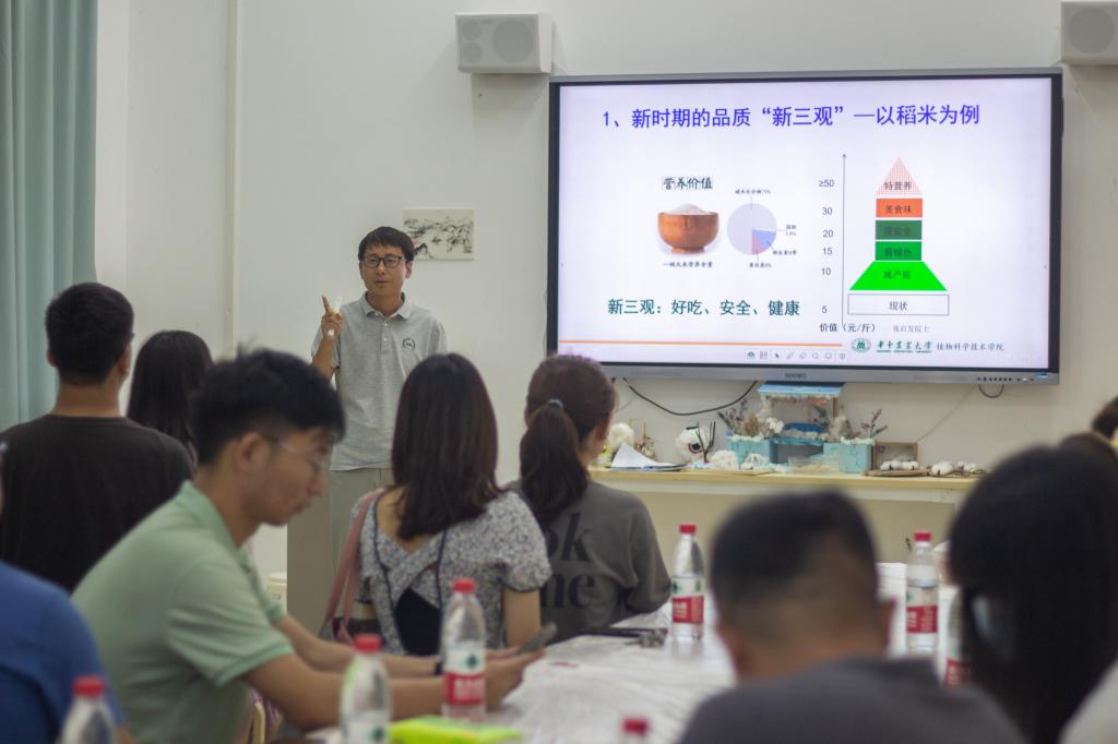 江洋向在场的同学们介绍了双水双绿的理念和模式。江洋戏称自己是水稻种植中最会养小龙虾的人,他以水稻为例介绍了新时期品质新三观即好吃、安全、健康。他指出现如今存在高品质、绿色、有机等概念被滥用,信息不对称、不真实、不科学导致消费者对绿色农产品失去信心。江洋重点推介了双水双绿研究院出产的绿色稻米“尉迟夫人”,尉迟夫人是一款由黑米“华墨香”和白米“华贵”混配而成。他表示,相关研究表明黑米中花青素具有非常好的健康效应,“双水双绿”研究院致力于研究“好吃的黑米”,聚力推动黑米“主食化”。