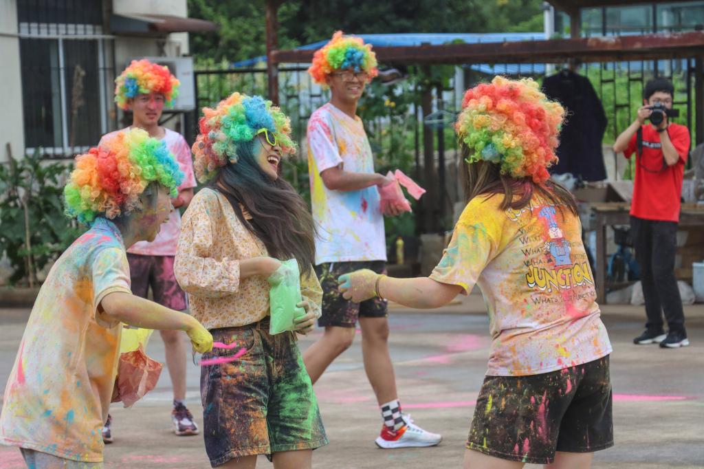 在大家到达最终点玉米基地后,主办方为所有参与者发放了彩虹粉,供大家泼洒。随着情绪的持续高涨,同学们开始肆意地挥洒着手中的彩虹粉。一时间,整个玉米基地变成了一个大型欢乐海洋,彩色的玉米粉描绘出一道道彩虹,映射在大家的身上。