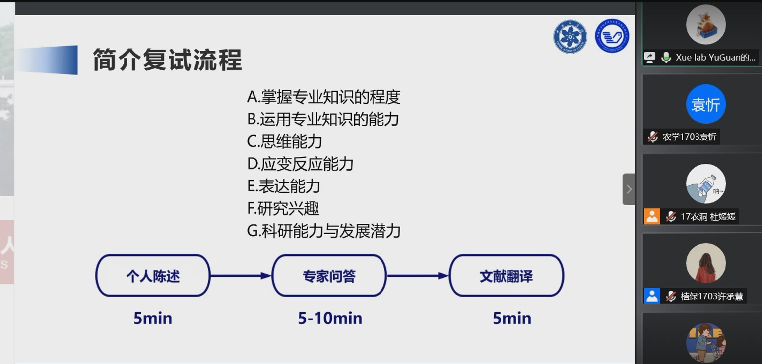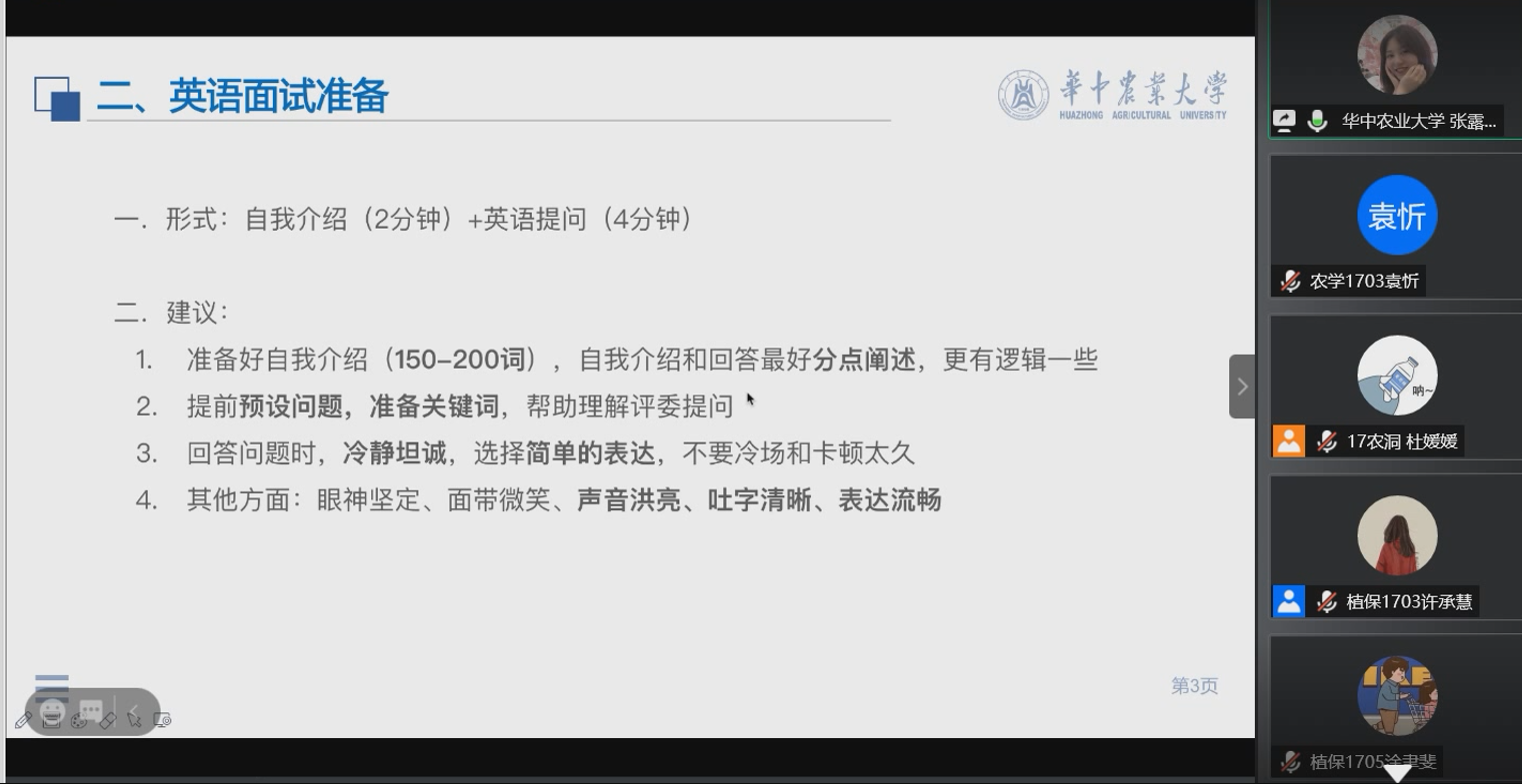 2月6日晚以“研途风景,与你共享”为主题的考研复试经验分享专题讲座在线上举行。我院17级150余名同学参与本次活动。活动由五名考研的16级毕业生结合自己复试经历分享自己的经验并提出建议。