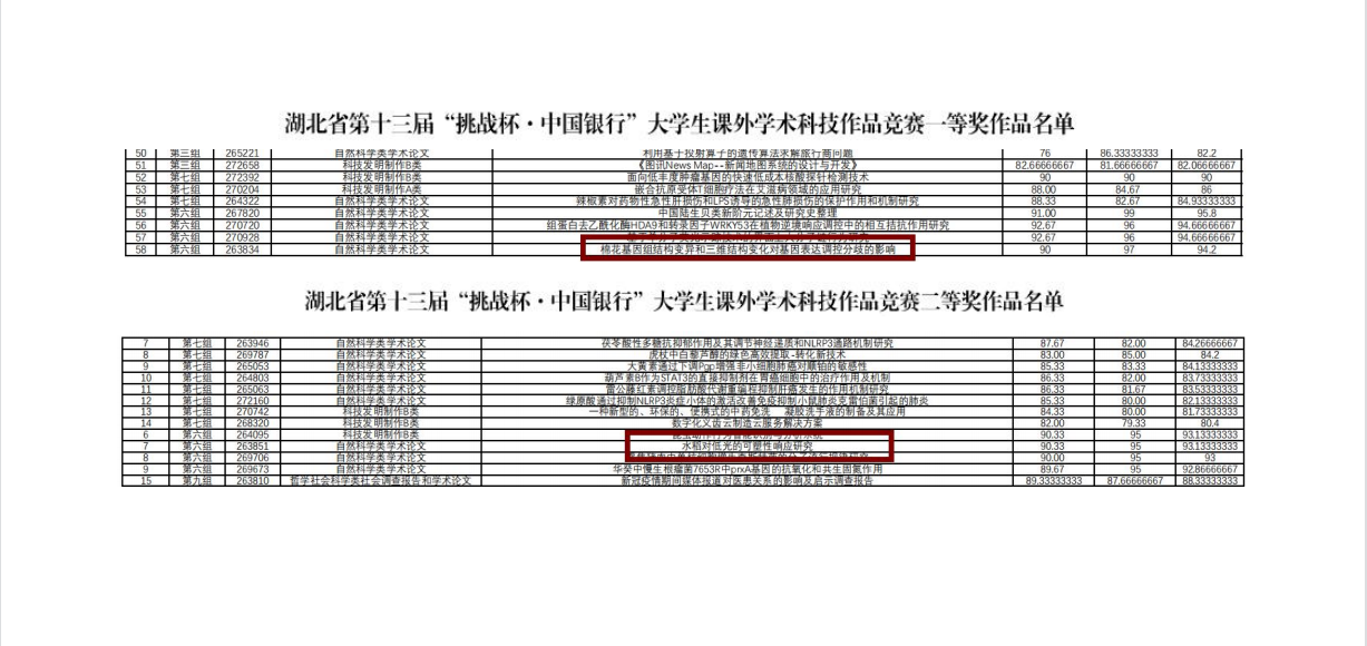 5月12日,湖北省第十三届“挑战杯”大学生课外学术科技作品竞赛决赛结果出炉,我院两个项目分别斩获省一等奖、省二等奖。