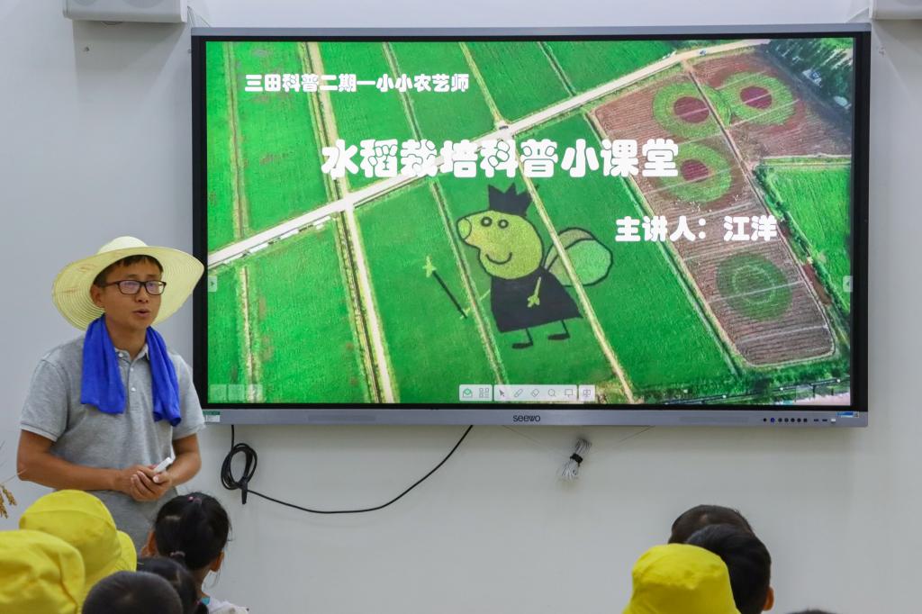 在《稻田里的小生命》课堂上,小朋友们参与了江洋老师的互动课堂,江洋老师生动的讲解引发了小朋友思考和探究兴趣。江洋还借助动画片,生动有趣地展示了水稻的生长过程,介绍了株高与生育期的关系等问题。课堂中他向小朋友们提问道:“水稻大概要经历多长时间才能从种子发育到成熟呢?”小朋友们争先恐后地回答,“100天!”“90天!”,答案层出不穷,他对小朋友们的认真听讲给予了表扬。在介绍生物防治时,小朋友们和江洋互动了“鸭子为什么只吃杂草,不会吃水稻吗?”的问题。小朋友们还积极讨论了生活中哪些常见食物是由稻米制成的。大家在讨论和思考中增长知识。